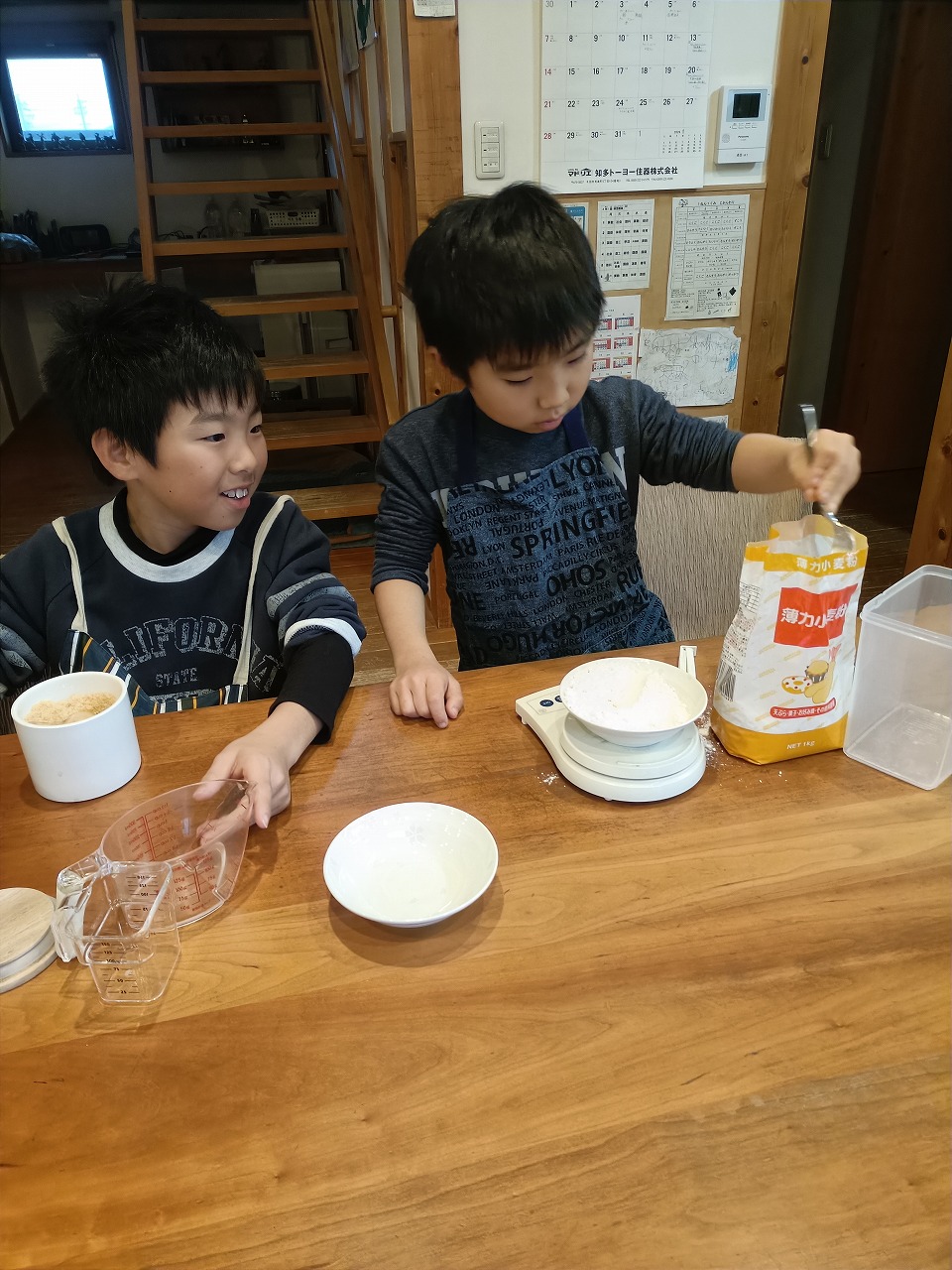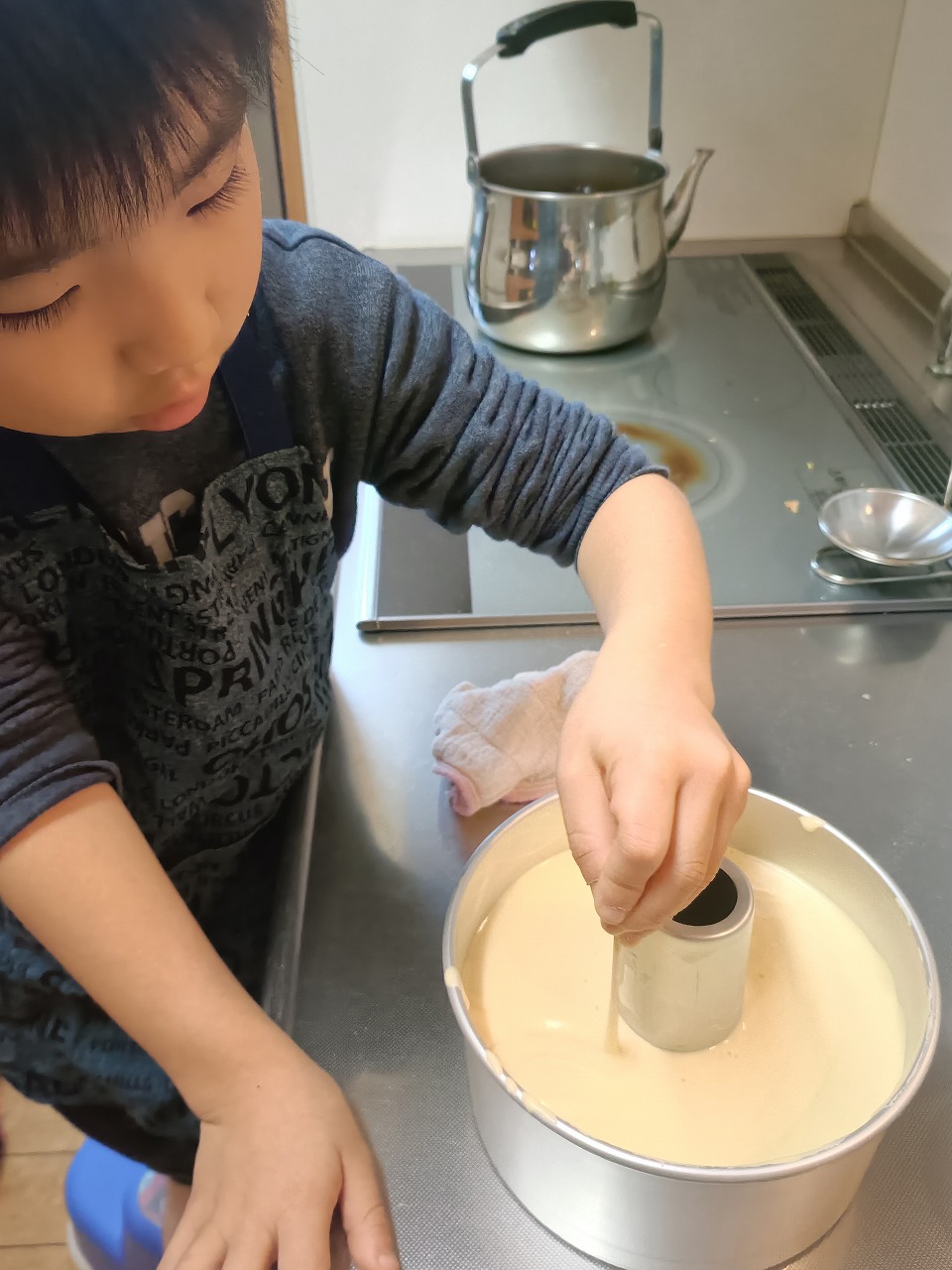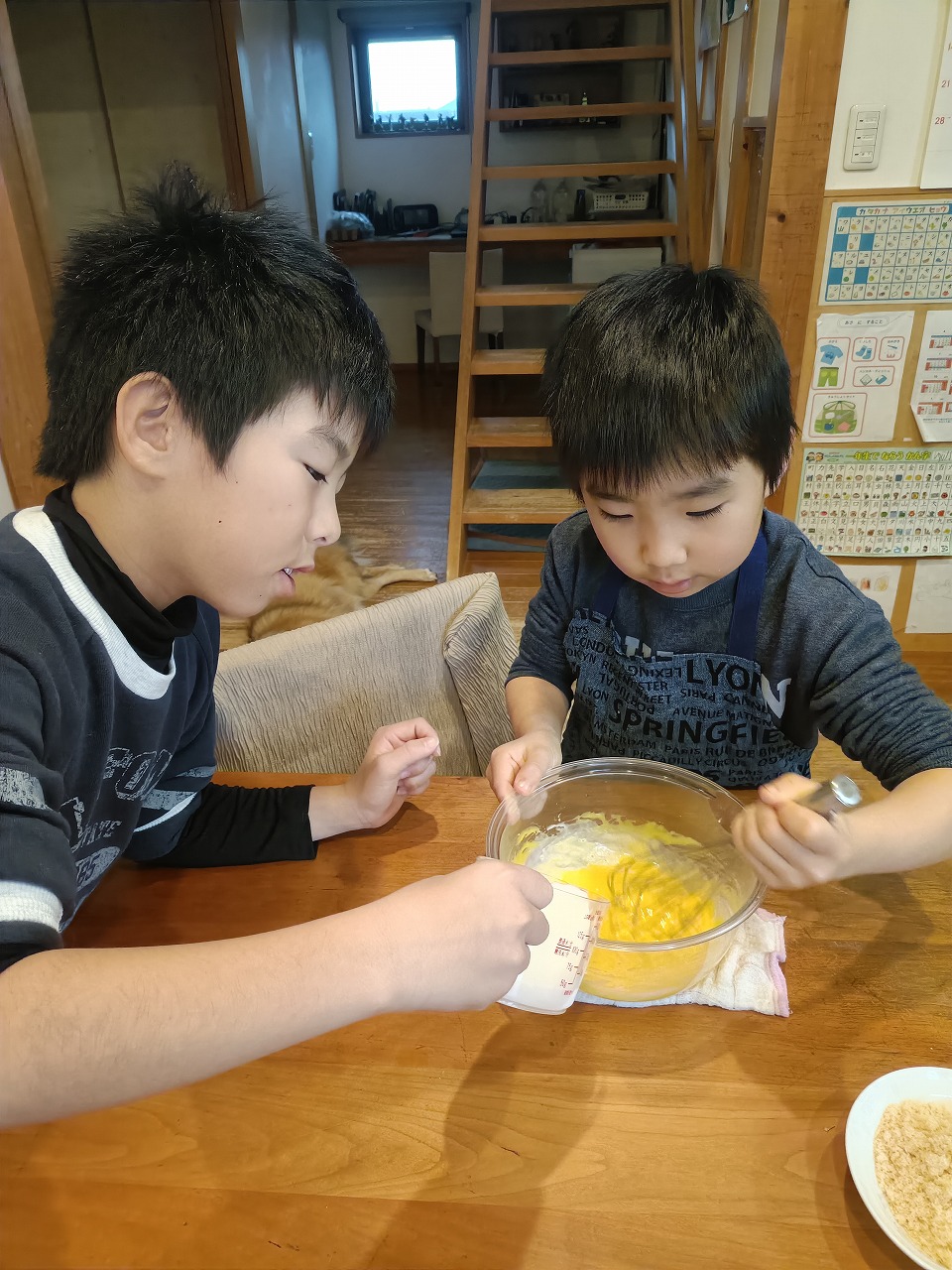 部活がある長男は、朝から学校に向かいます。残った2人に手伝ってもらいながら、シフォンケーキを作ります。YouTubeで作り方を見てもらい、チャレンジ!!こういう時にYouTubeって便利です。文字だけで「こうする」「あ~する」だけじゃなく実際作っている様子がみれるので、どれくらい混ぜるのか…とかが伝えやすくていいです。