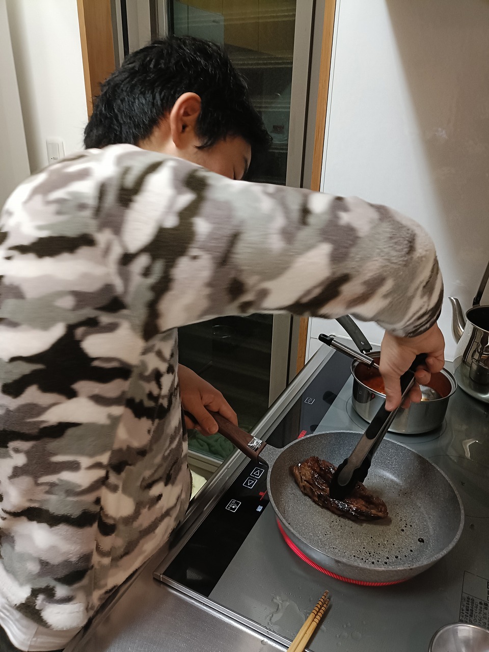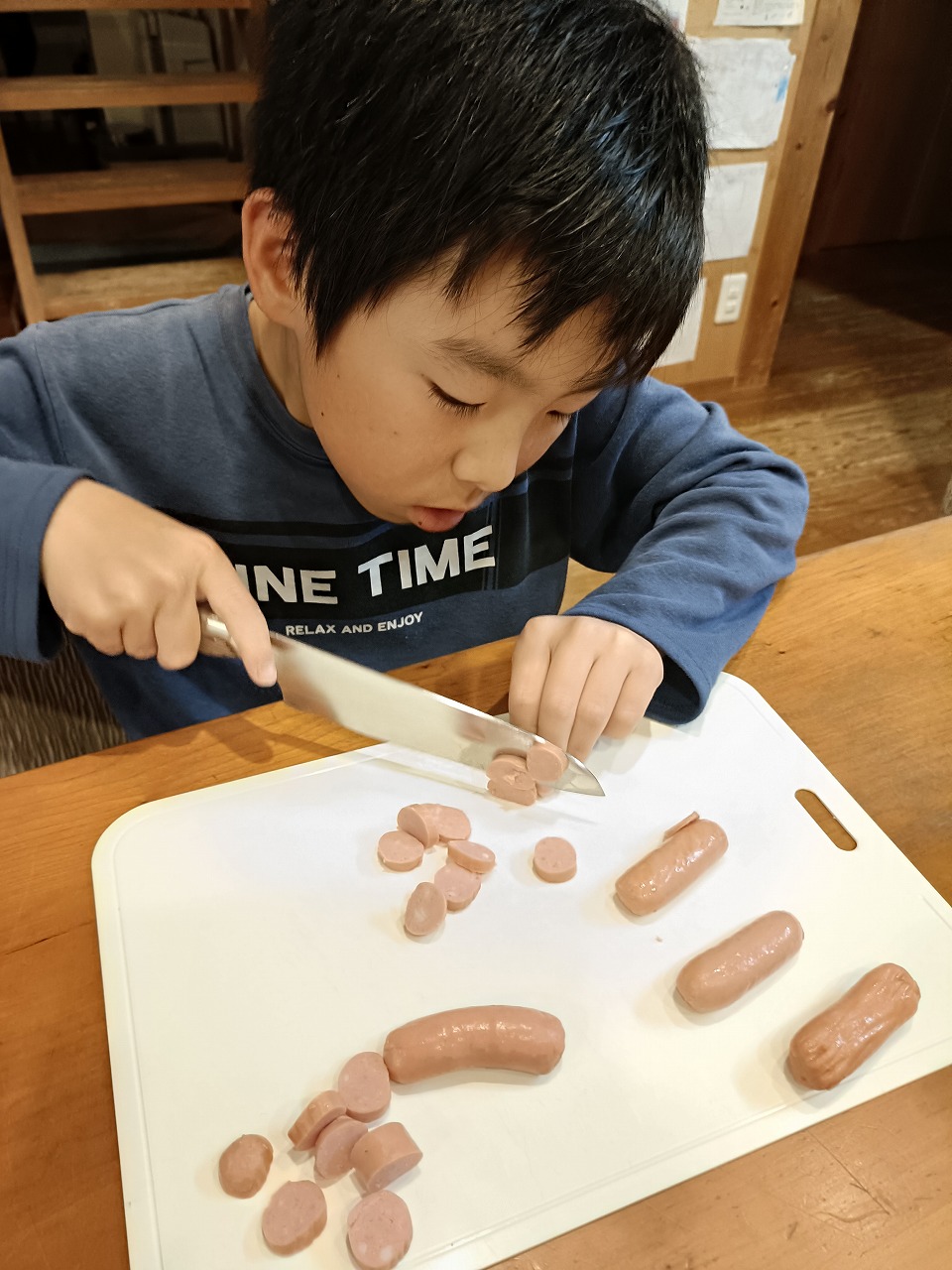 午後になり、みんなやりたいゲームをしながら、ケーキにトッピングするチョコプレートの準備をしてもらいました。夕飯の前にお風呂を終わらせてしまい、みんなで大騒ぎの夕飯準備です。お客様から教えてもらった焼豚、レンジでチンするクリスピーチキン。サーモンのクラッカーのせやスープを準備。