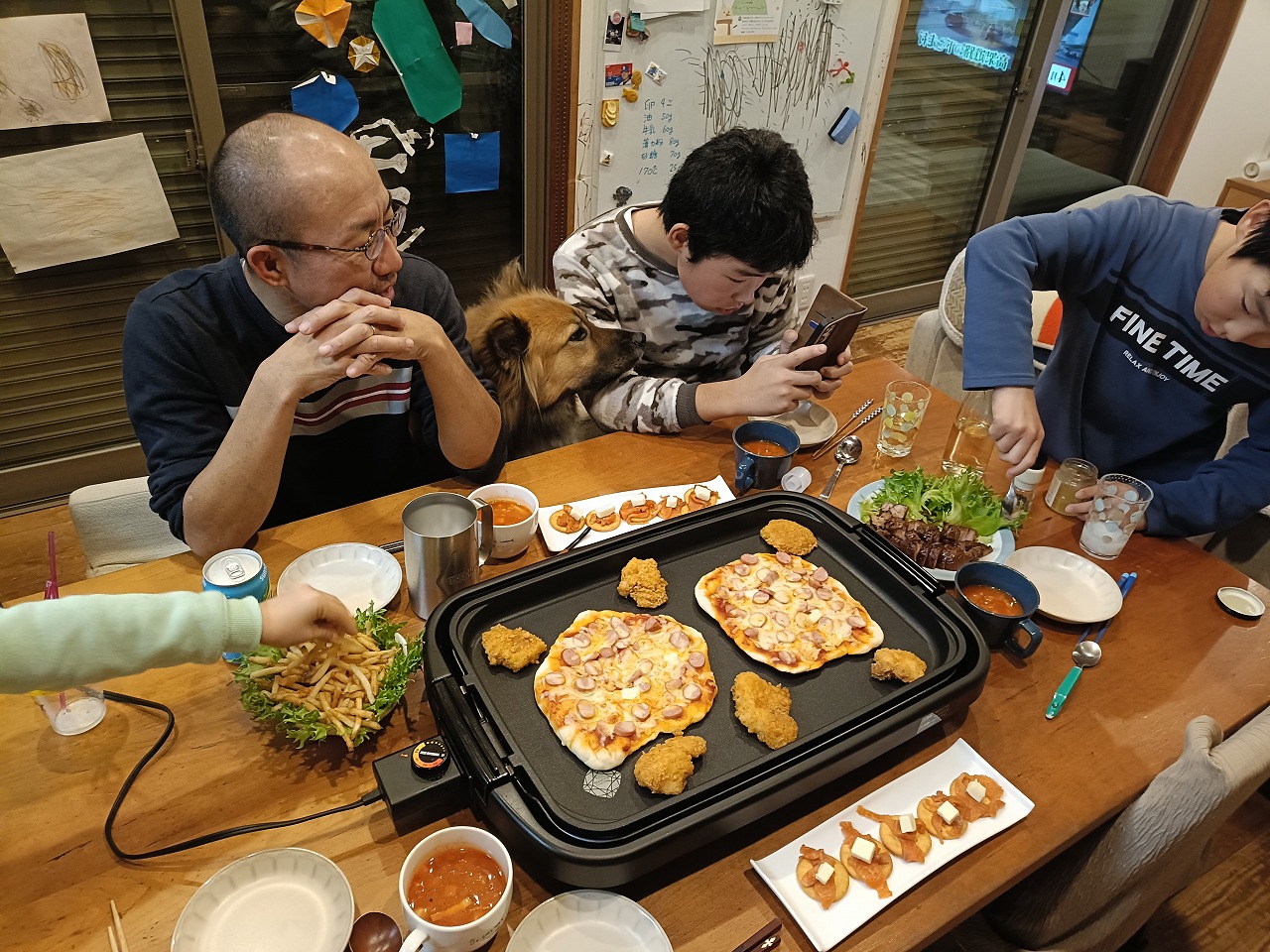 捏ねたらできるピザ生地は、長男が市民運動会でもらってきてくれた景品です。新しく買った特大ホットプレートでピザを焼きました。保温もできるので、温かい物はホットプレートへ。琥珀も真ん中を陣取りスタンバイ。