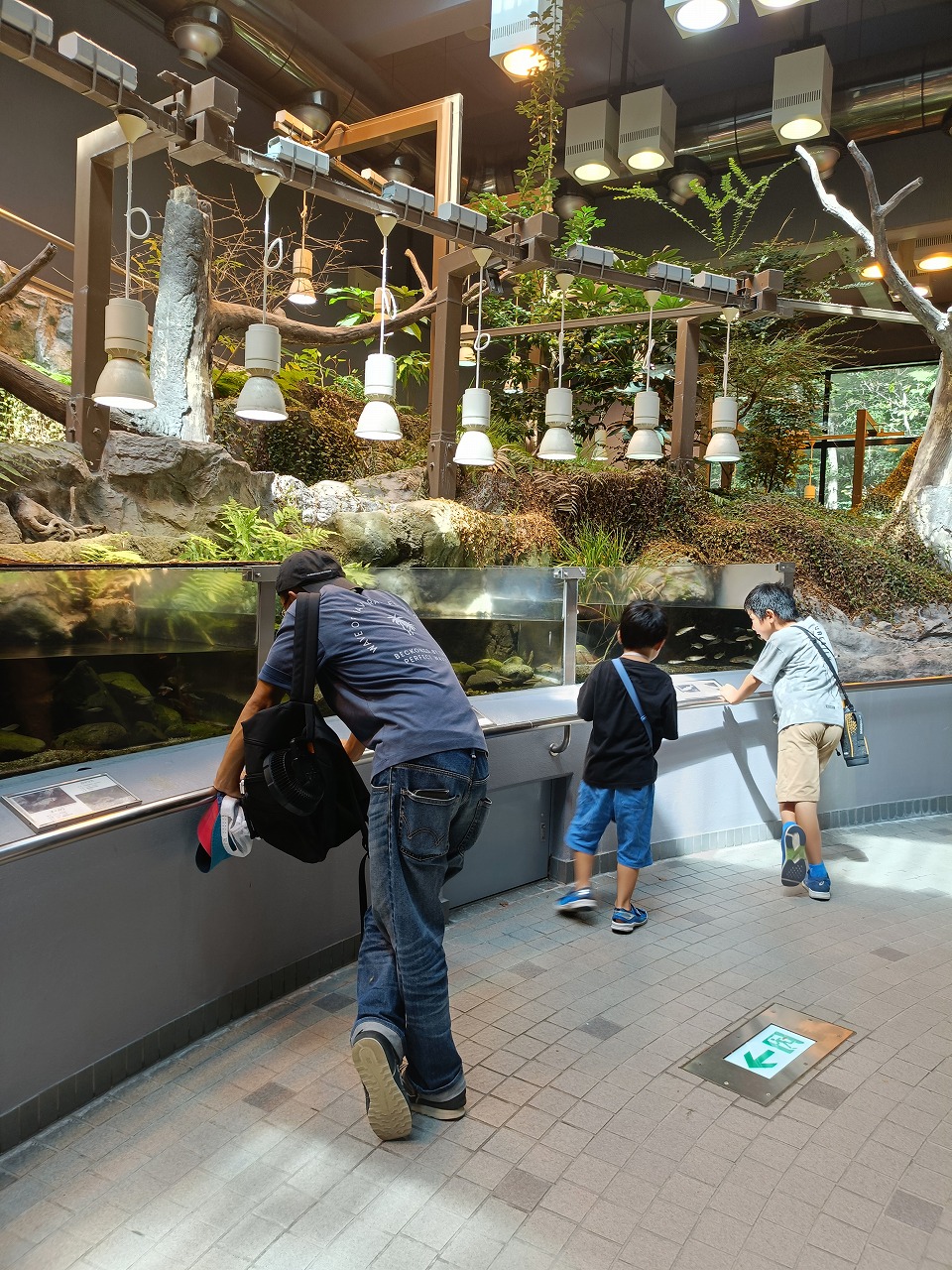 メダカ館の涼しいお部屋に入ると、居心地よくて長居をしてしまいました。我が子たちは、どちらかと言うと動物より水族館の方がテンション上がるようです。