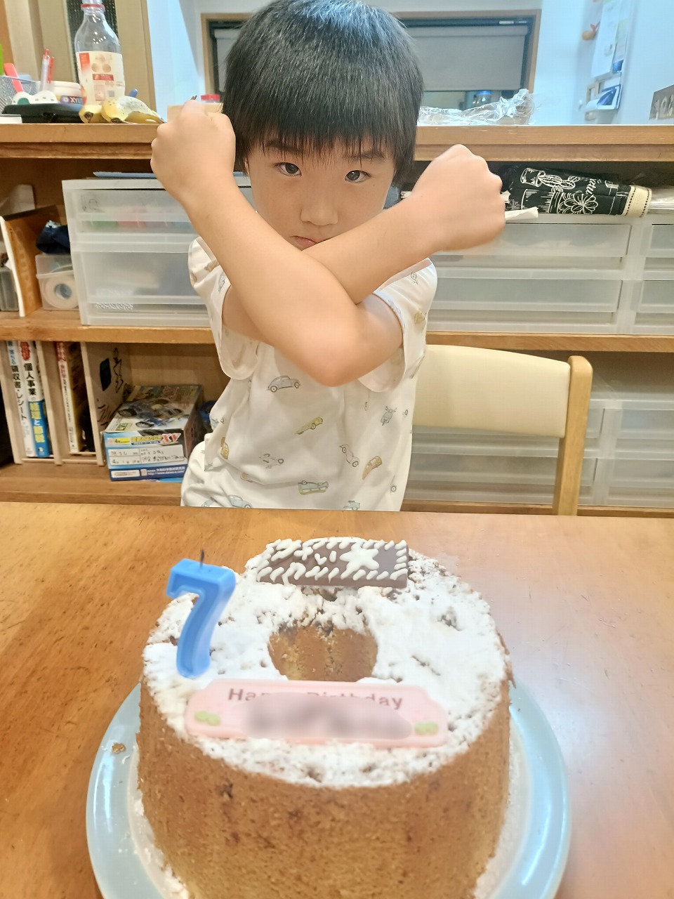イチゴやフルーツ、クリームが好きではないタイプの三男。色々考えて今回はシフォンケーキを手作りしてみました。チョコプレートは欠かせないので、2枚つけてチョコチップを入れたチョコシフォン。
