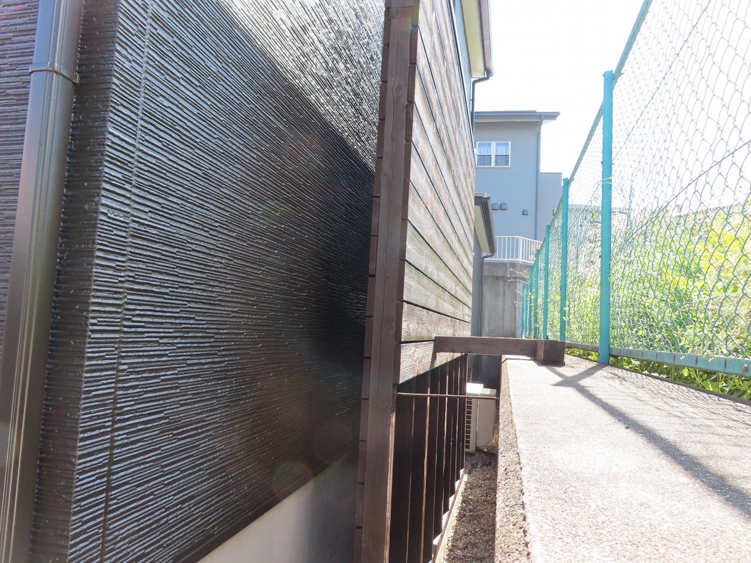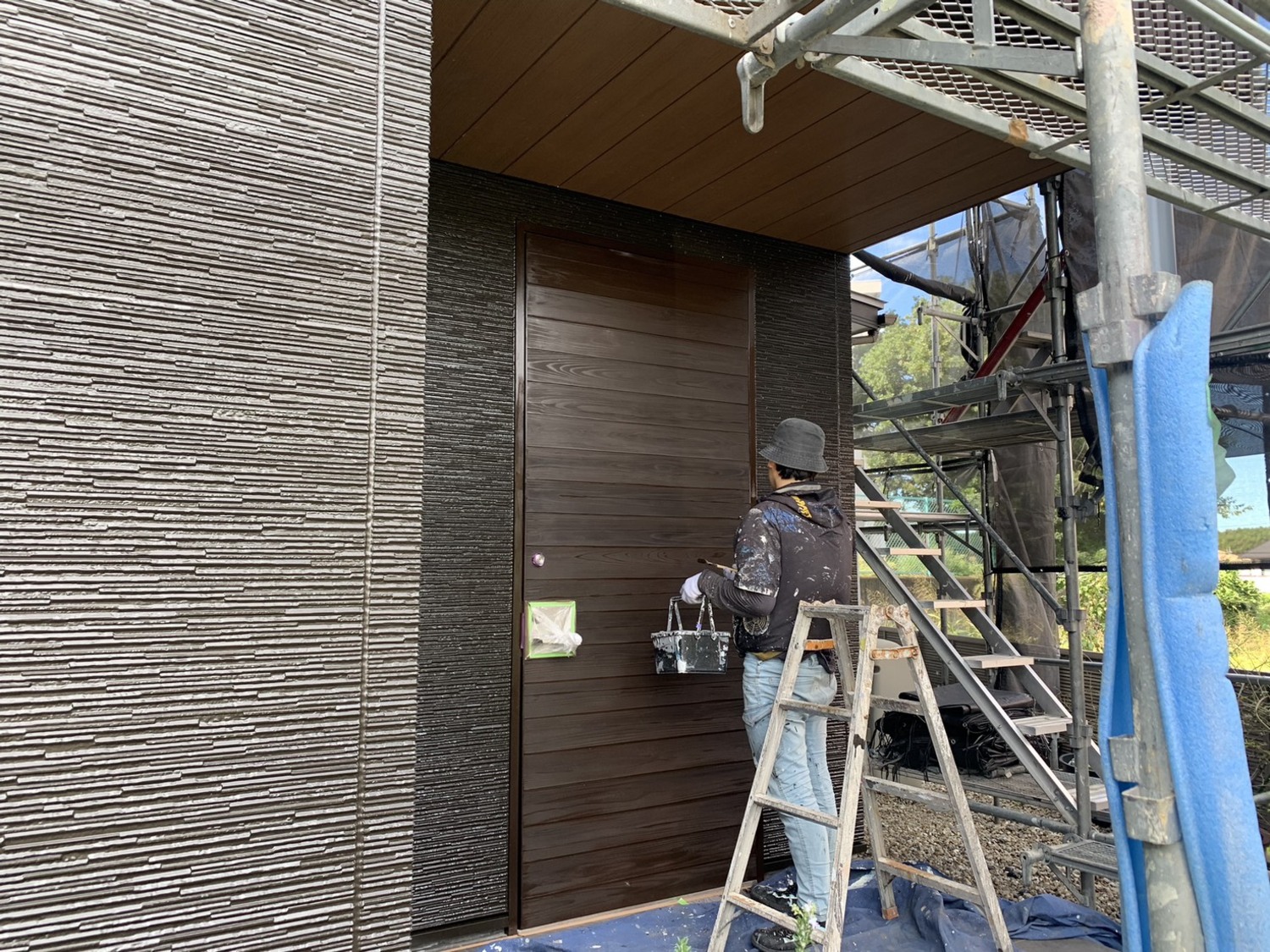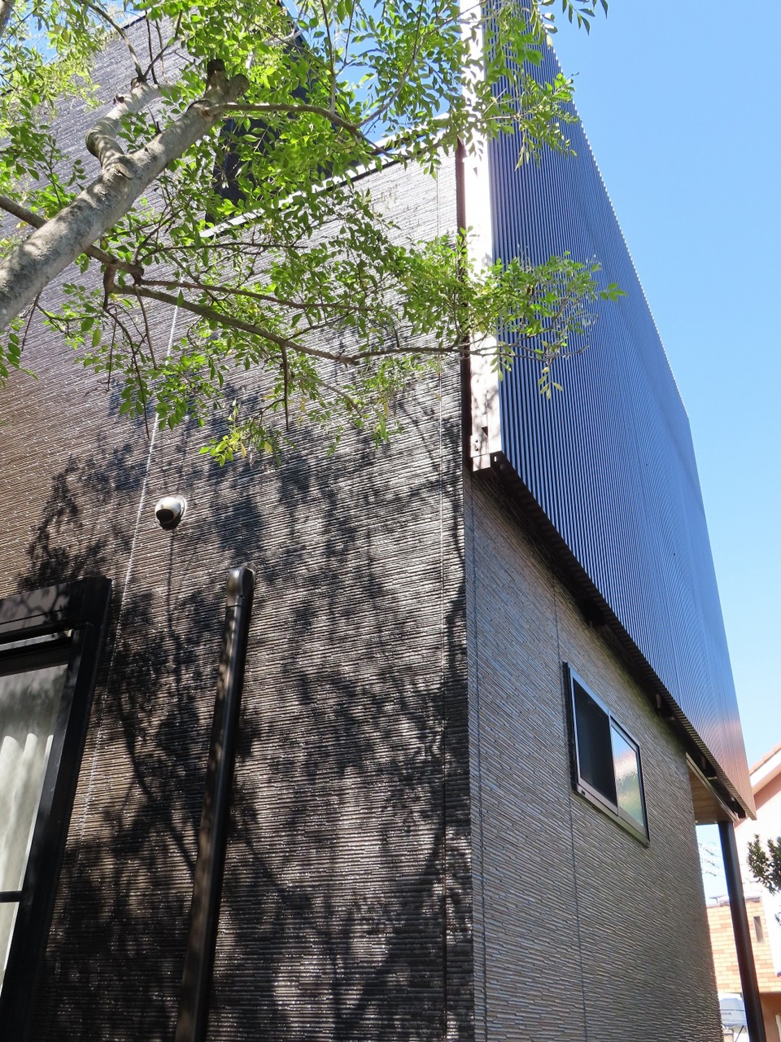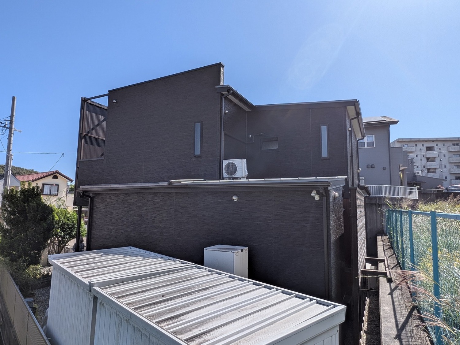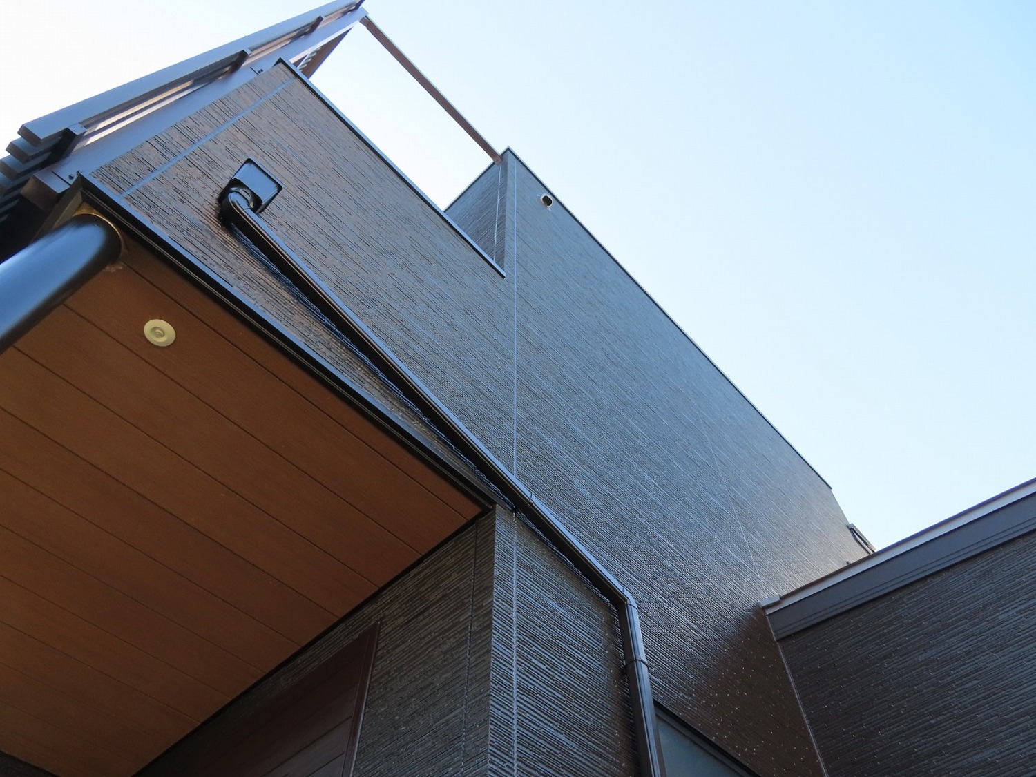 完成写真黒色に見えますが、少しブラウンが入っているので、キツイ感じはなくどっしりとした落ち着いた印象になったと思います。元は白色ベースの外壁だったので、ガラッと印象が変わりました。