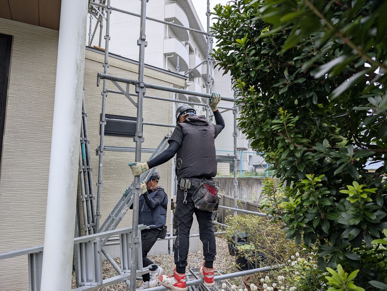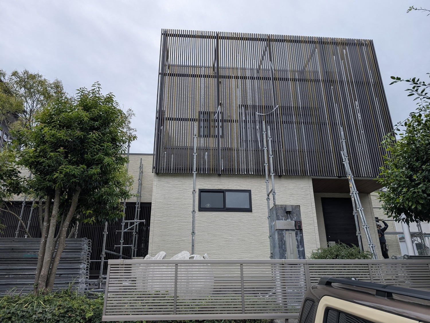 完成写真建物は大きく複雑な形をしていて、格子のメンテナンスなどもあり、シンプルな形のお家と比べると手間が多かった現場になります。形が複雑になると、足場を掛けるだけでも人手と手間が違ってきます。