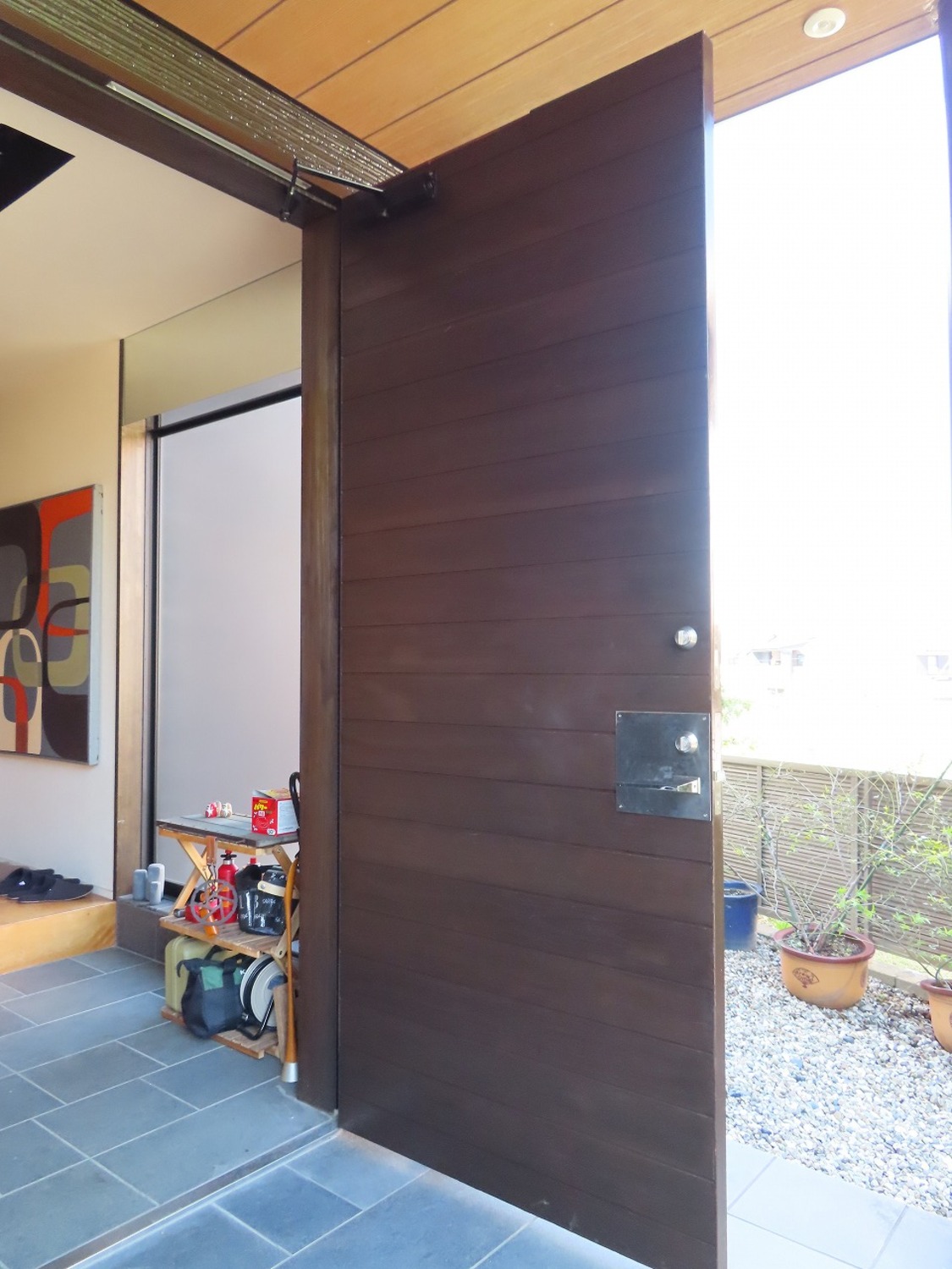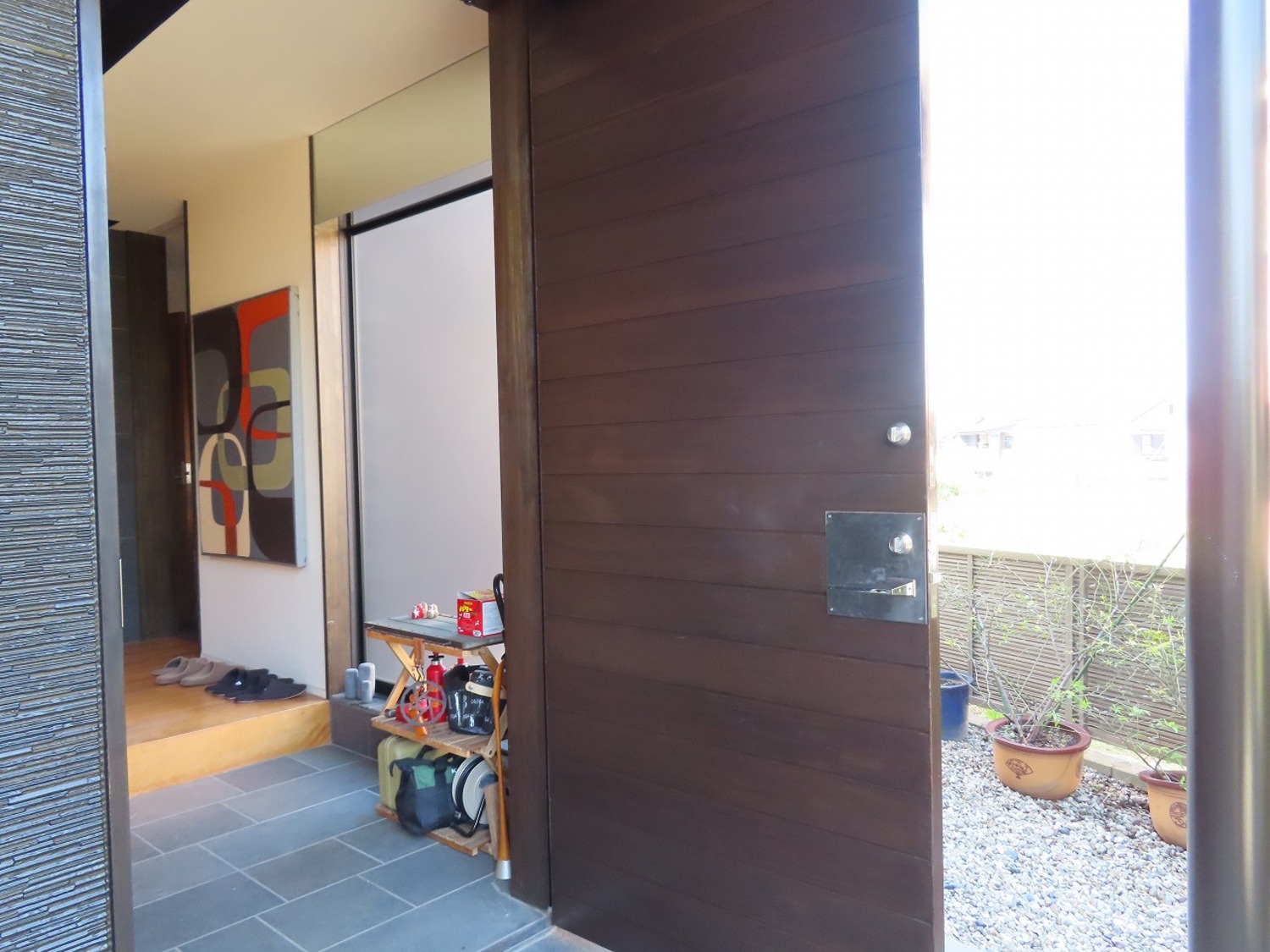 お客様自身で外側だけ塗装してあった木製ドアは反りがでてきていました。木製のドアは中も外も塗ることをお勧めします。片方だけ塗ってしまうと反りが出てきてしまいます。ドアクローザーを設置、調整を行い使いやすい玄関ドアにありました。