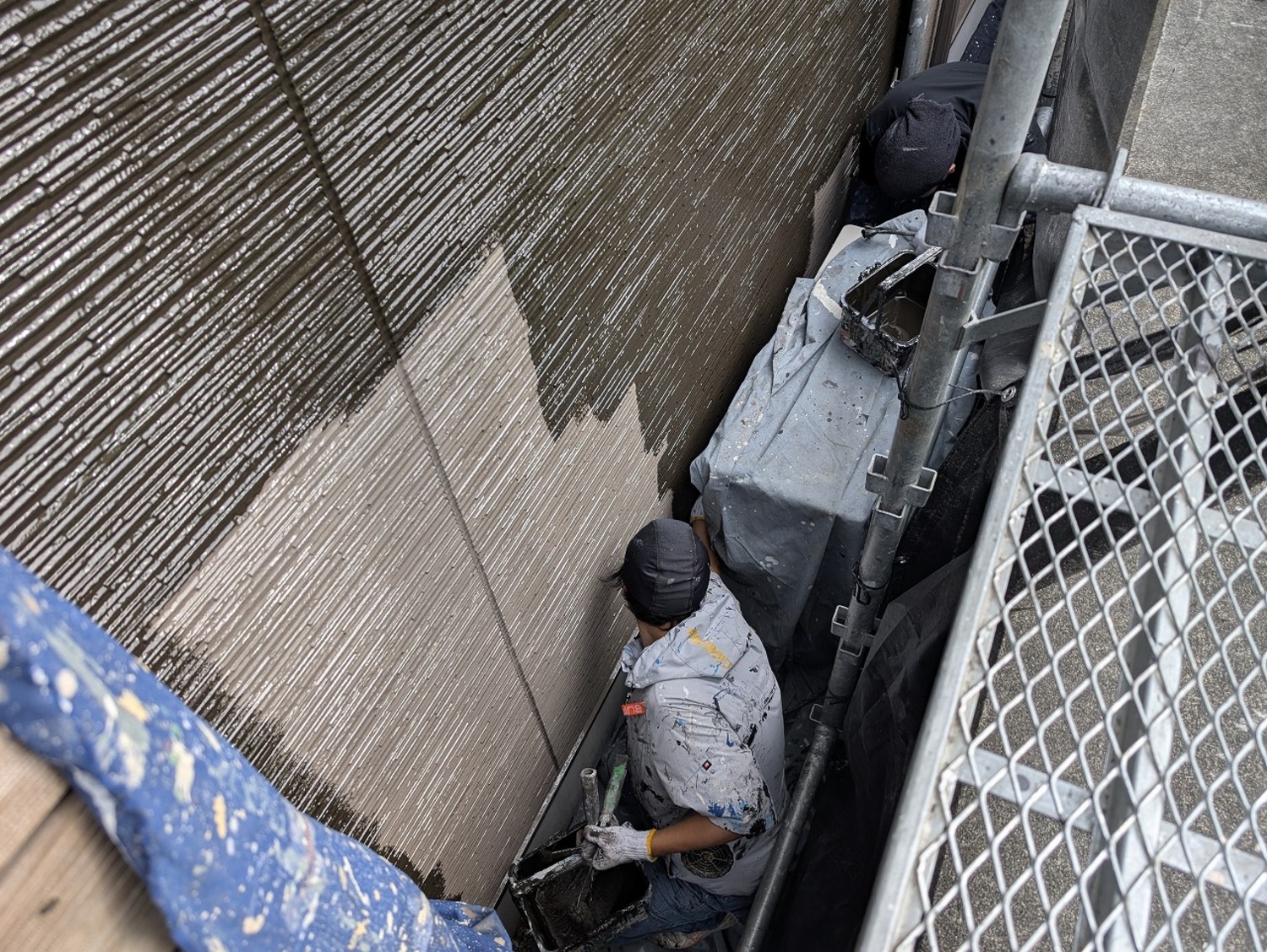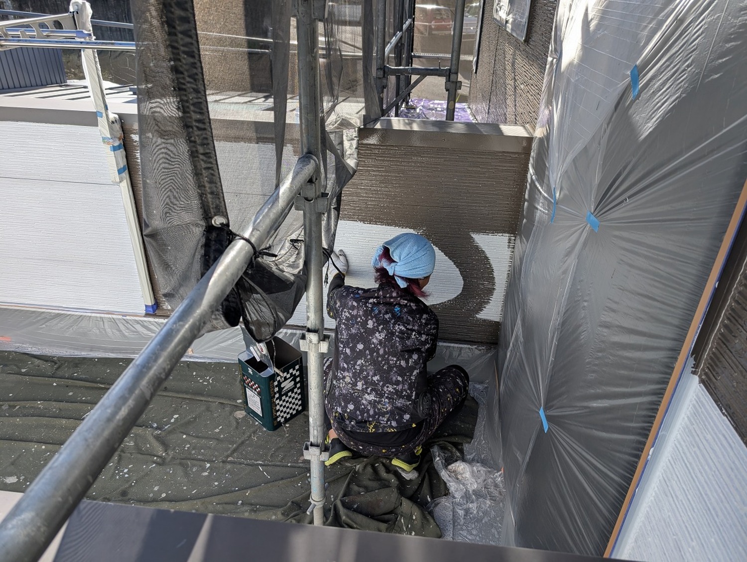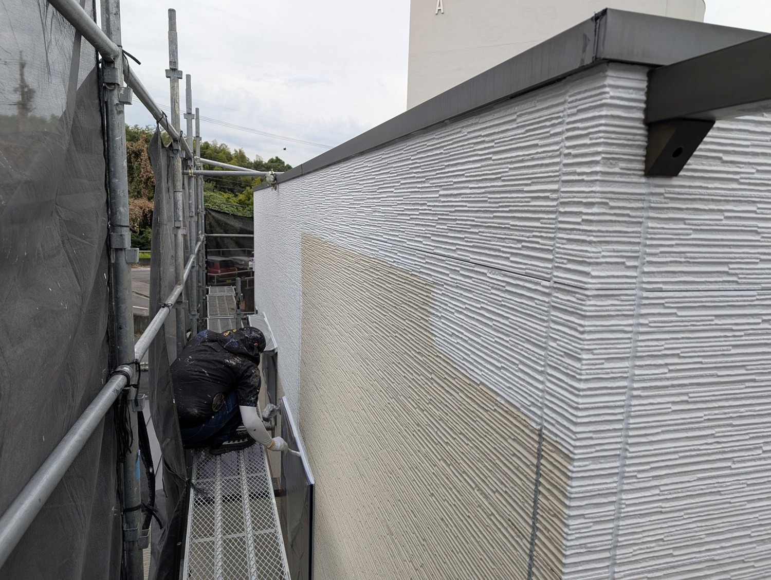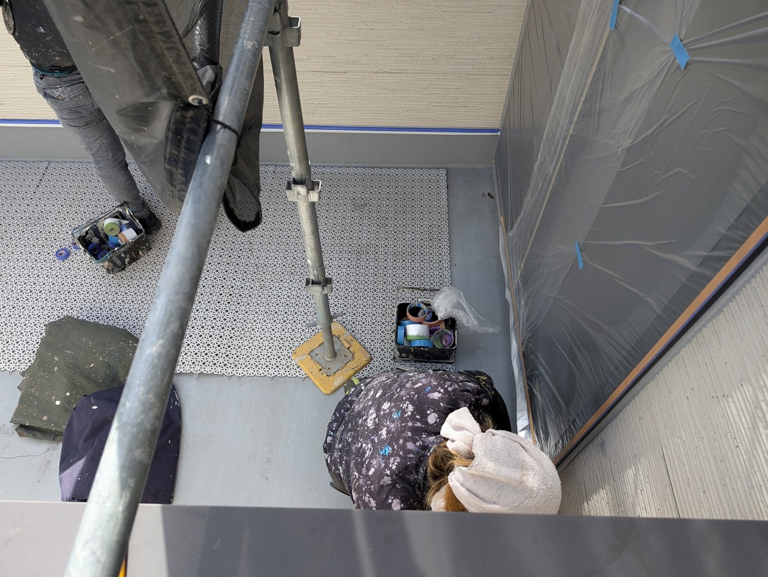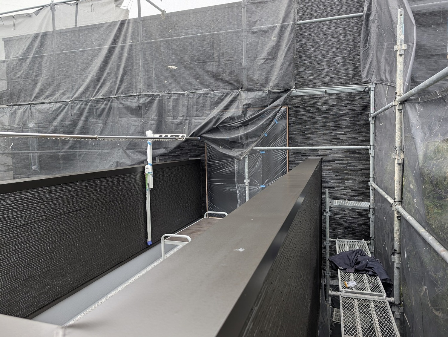 外壁は同じ色で塗っていきますが、ベランダの笠木部分などは素材が変わるので、同じいろでも感じ方が違います。