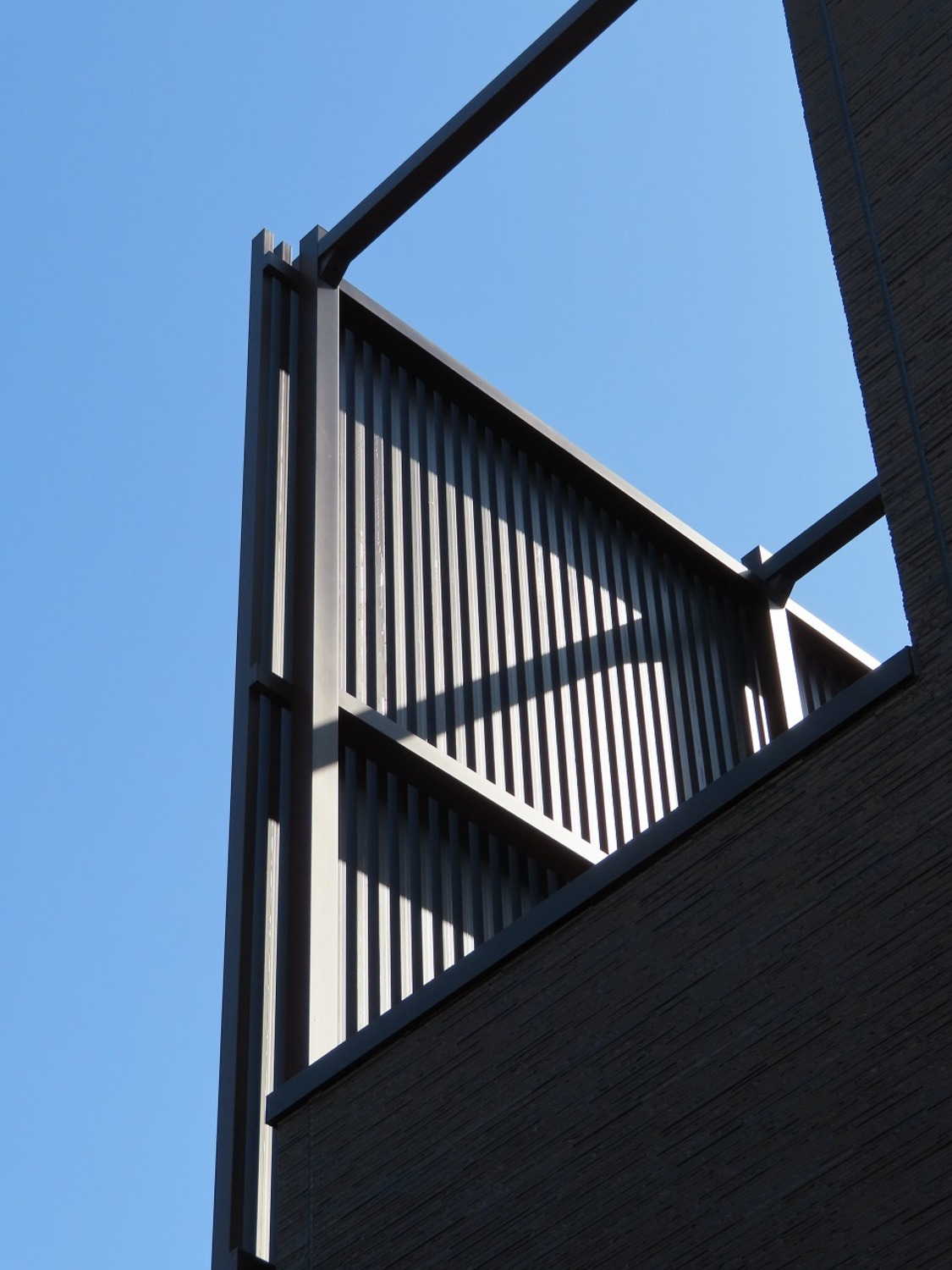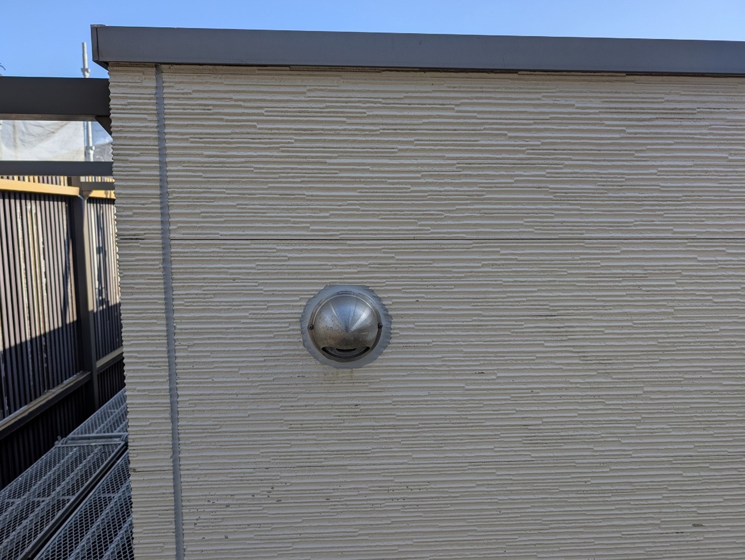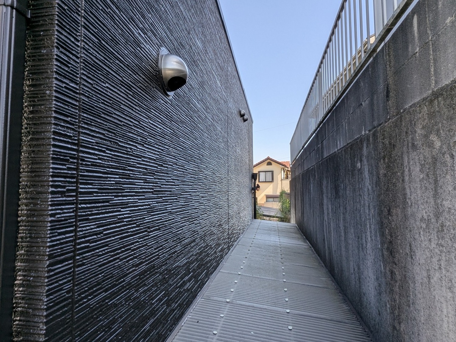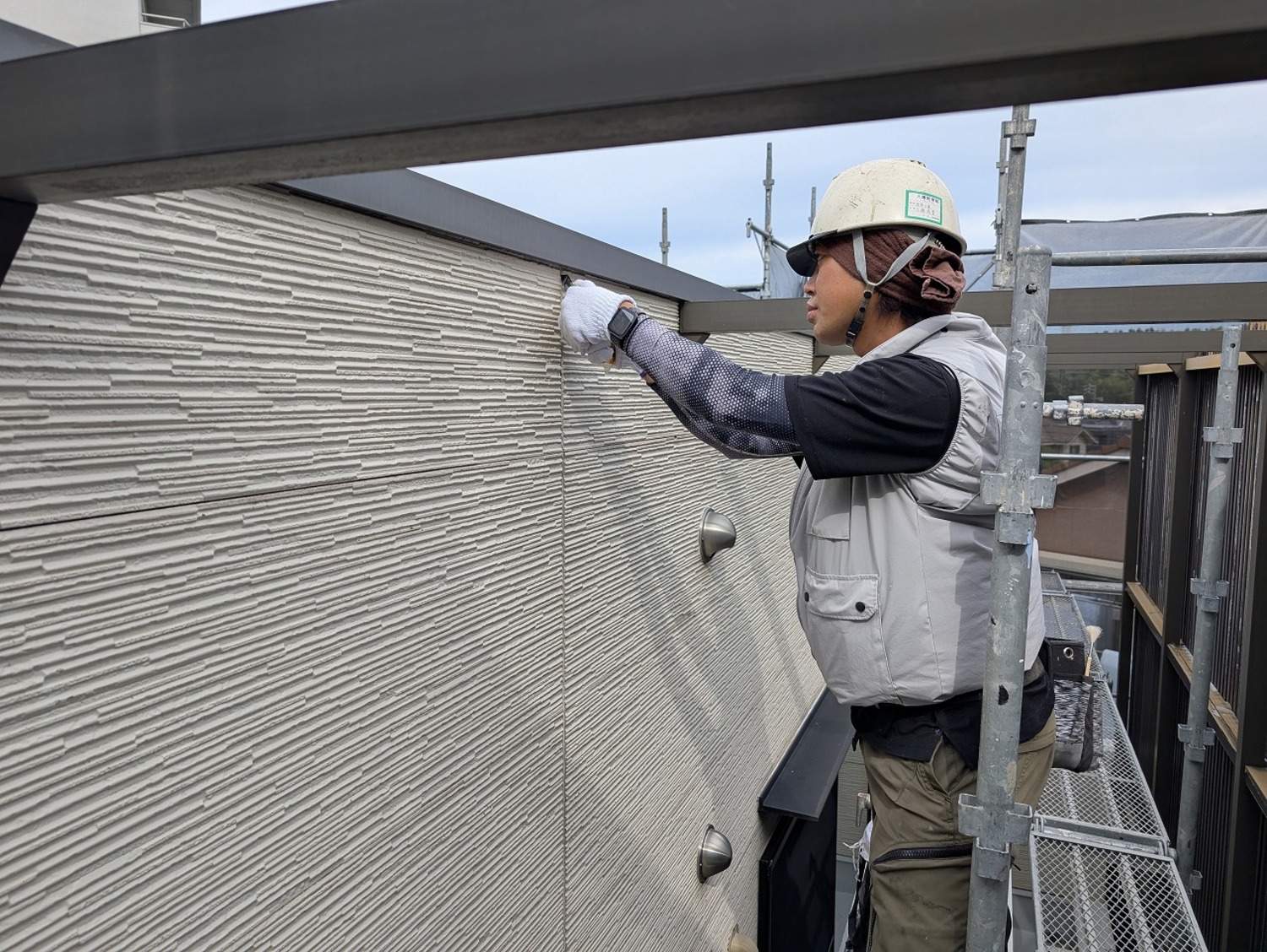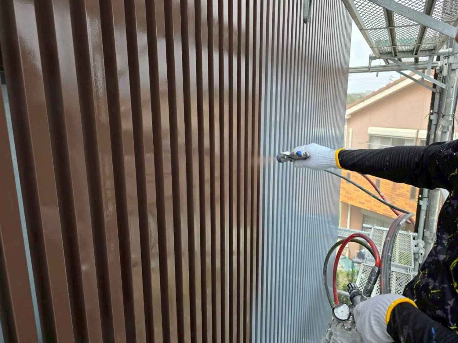 外壁は同じ色で塗っていきますが、ベランダの笠木部分などは素材が変わるので、同じいろでも感じ方が違います。