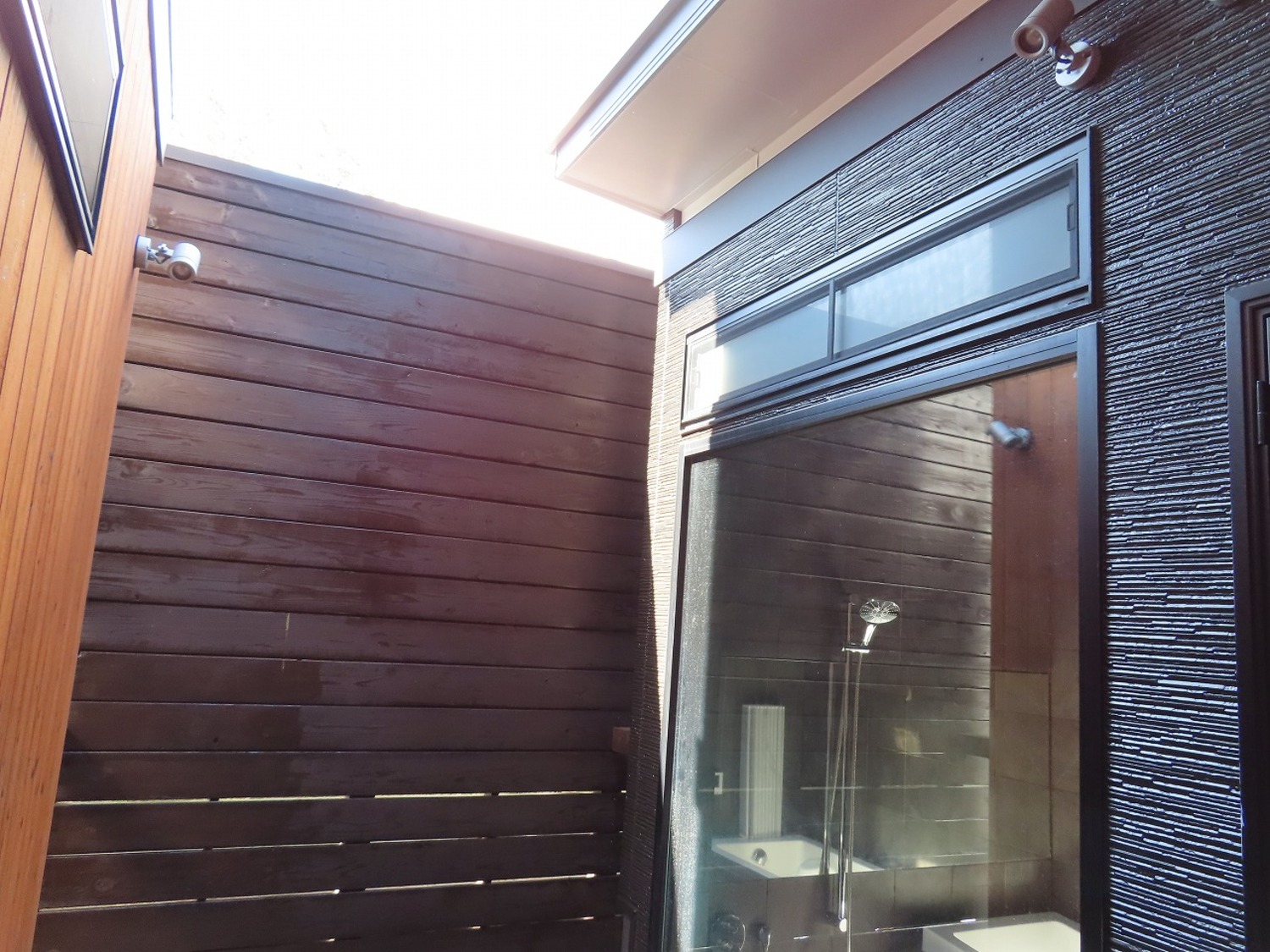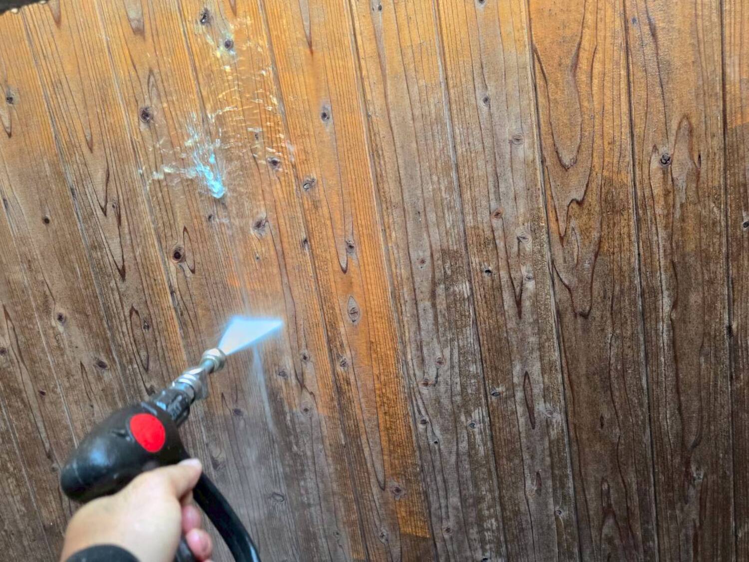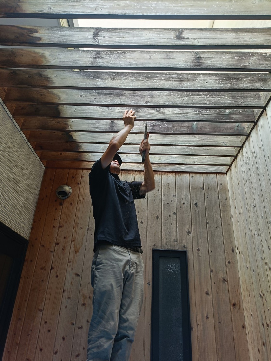中庭の木部分も同じように洗っていきます。紫外線に当たっている部分はやはり劣化が気になります。