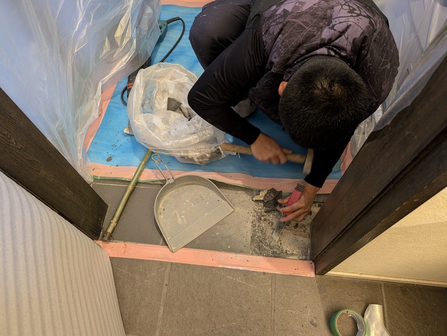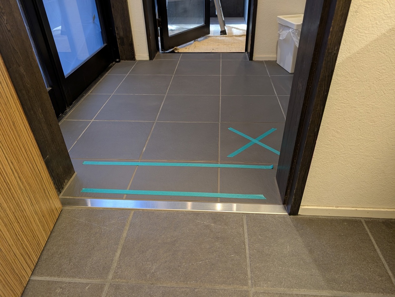 脱衣スペースのタイルの割れがあったので、貼り替えて補修します。