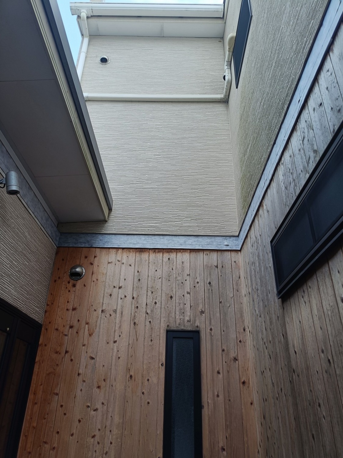 完成写真中庭があると足場の設置も大変です。もともとあった木格子は腐っていたこともあり、撤去することになりました。中庭が明るくなりスッキリとしました。足場もしっかりとかけることができました。