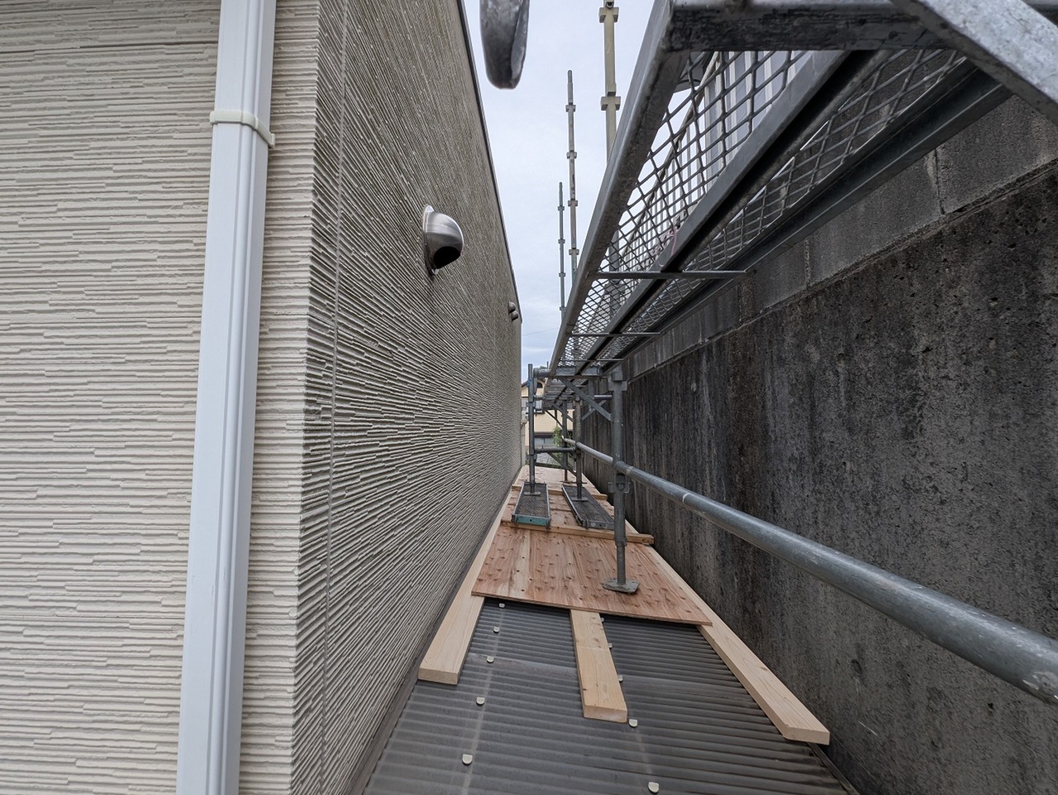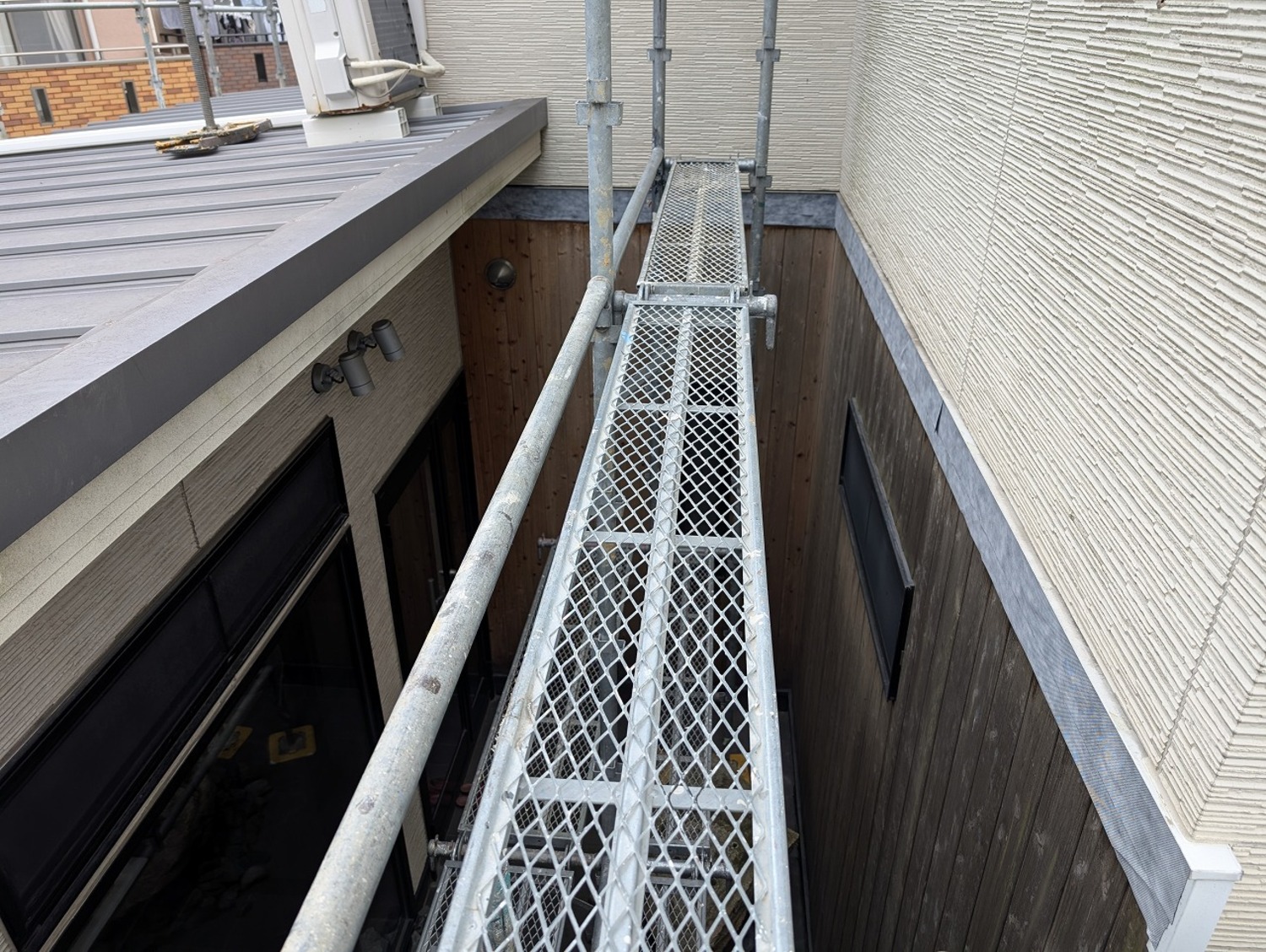 完成写真ポリカの屋根がかかっているところは、割らないように板をひいて気を付けながら足場を設置し、作業を行いました。中庭や下屋などがあるので、足場を掛けるのもしっかりと検討して設置しました。