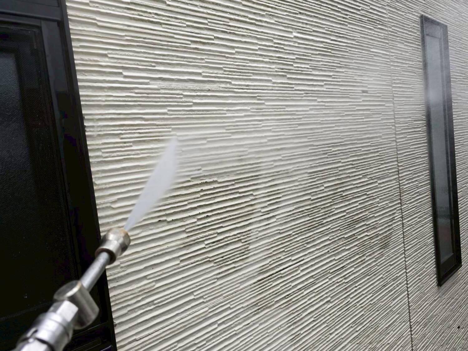 まずは、高圧洗浄で外壁を洗っていきます。苔むした汚れをキレイにとっていきます。