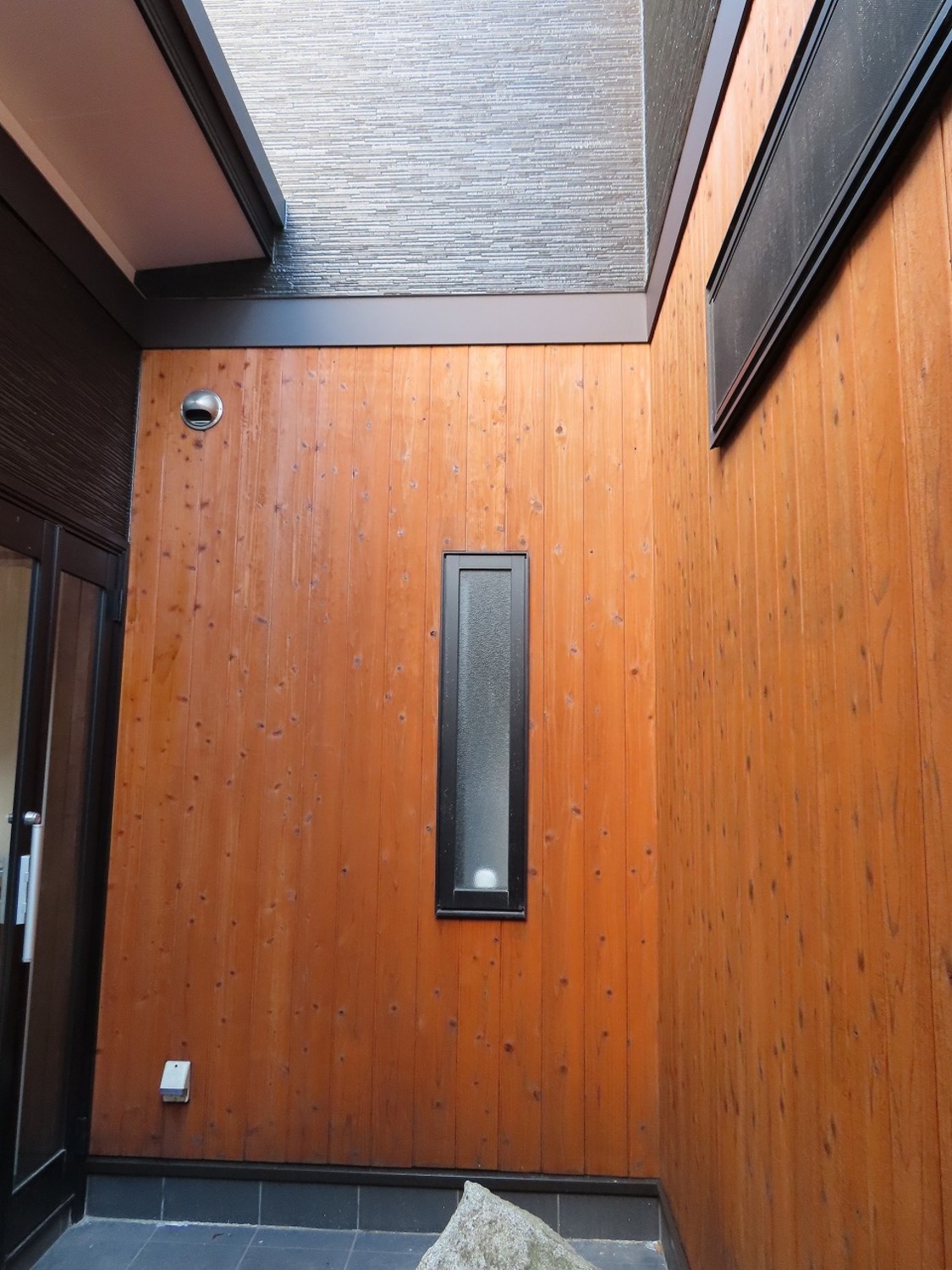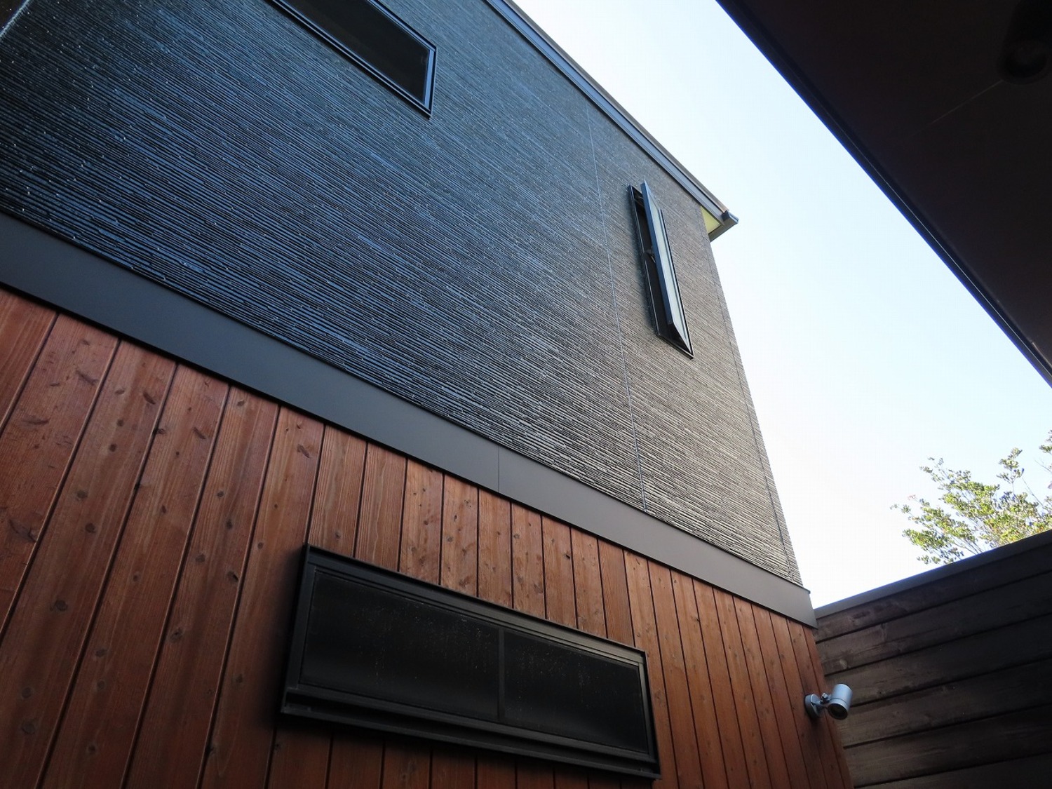 完成写真外壁で木材を使用すると、雨風にさらされ腐ったり割れたりの不具合が出てきます。外部で木を使う事のメリット・デメリットしっかりと把握した上での設計が大事になります。今回はきちんと洗浄し、木製部分は油性の塗料で塗装しました。