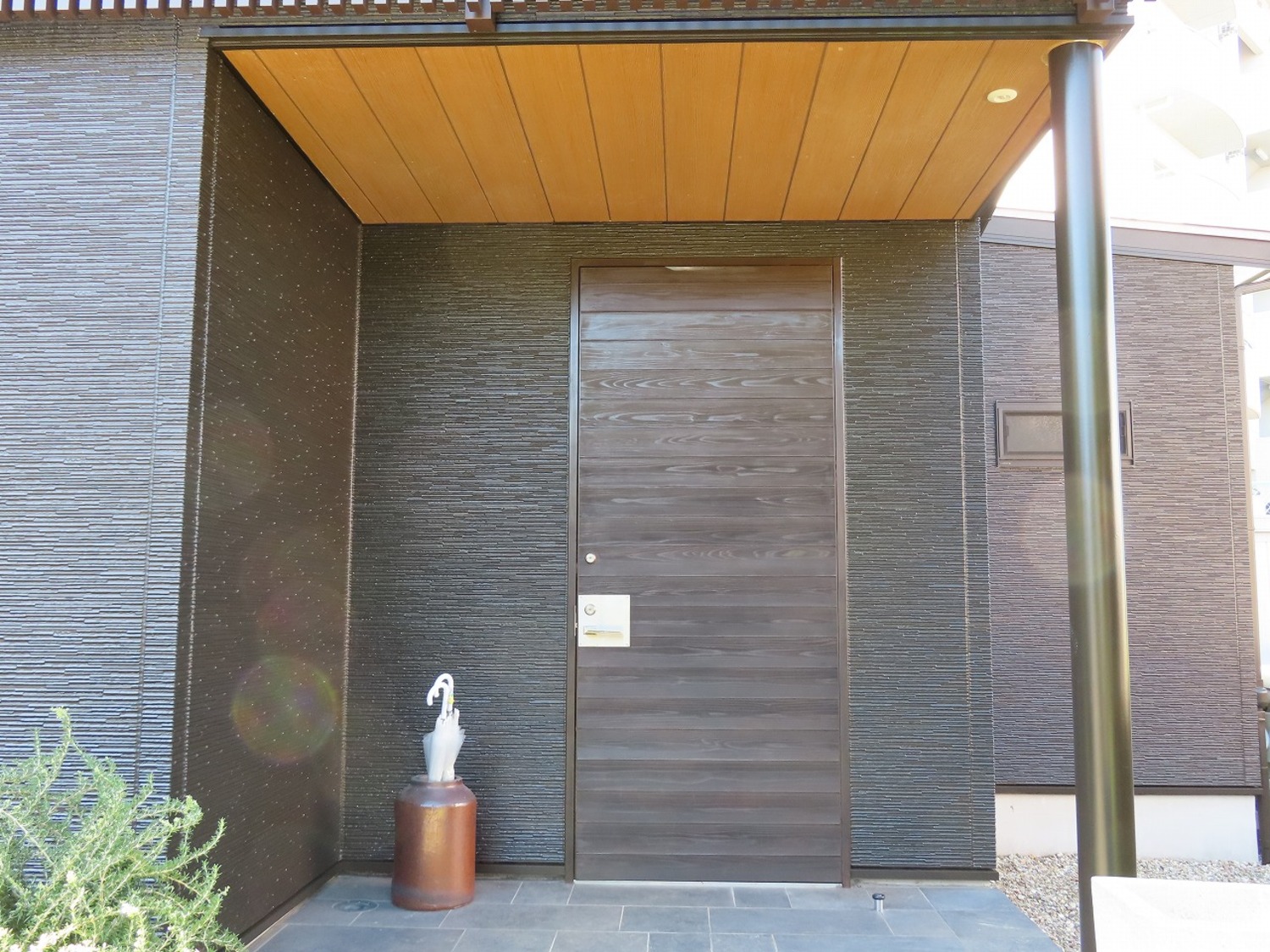 完成写真玄関ドアの外側だけ塗装がされていたので、今回は内外共に塗装しました。木製のドアは片側だけ塗装をしていしまうと反りがでてきてしまうので、注意が必要です。