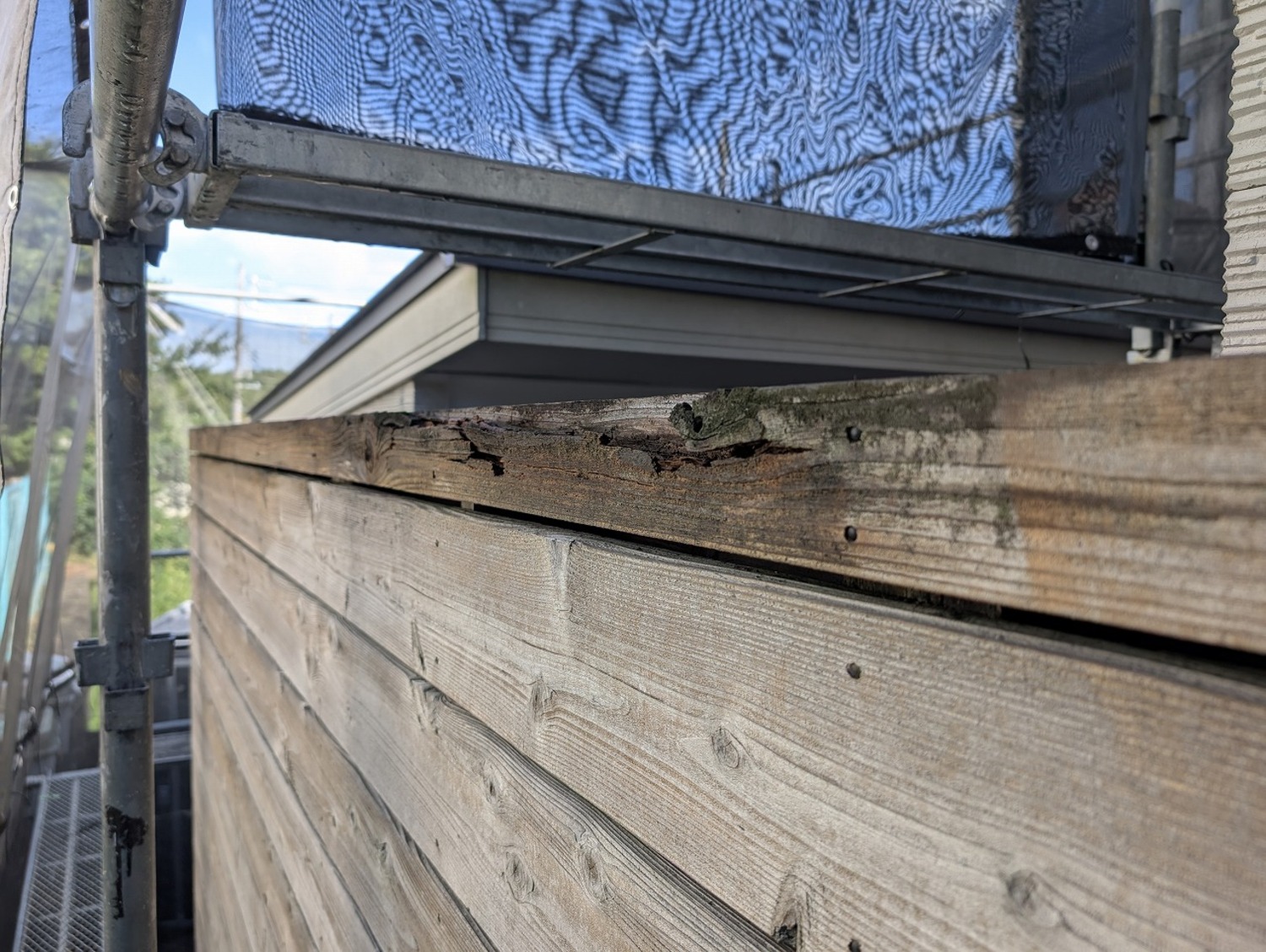 完成写真木格子を撤去した部分は雨漏れ等がないように防水シールを貼り、板金で処理しました。板金部分までをブラウンブラック、木材部分は鮮やかなオレンジがかったブラウンで塗り分けました。