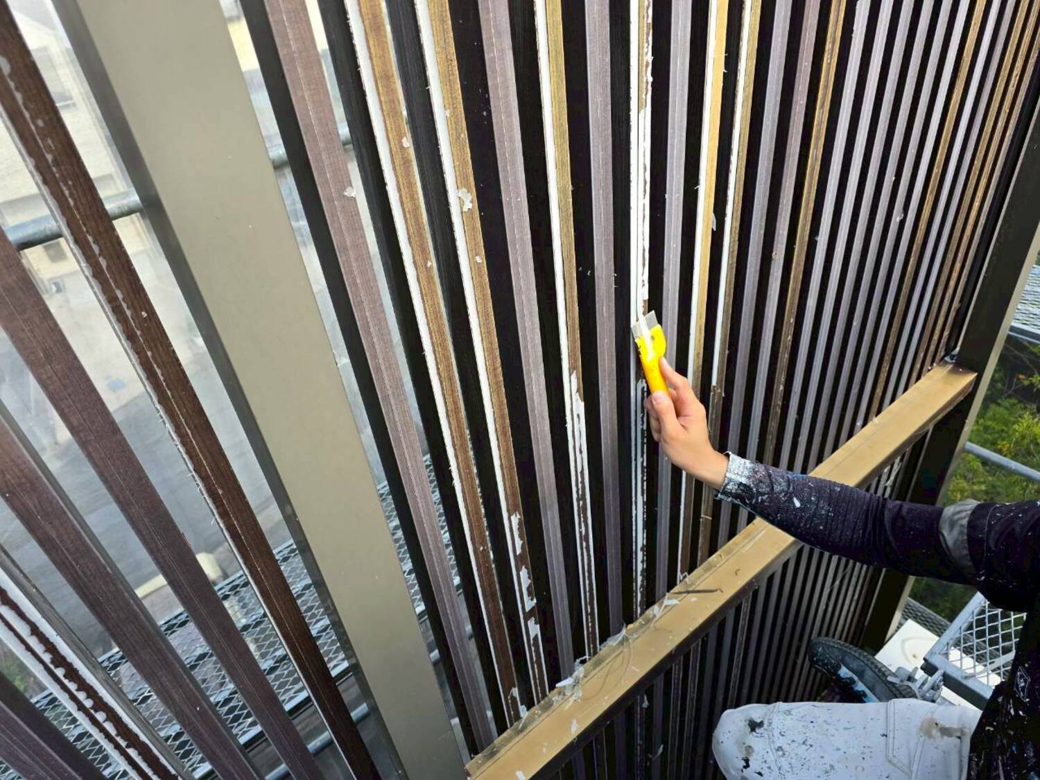 完成写真格子の剥がれている物が何なのかを調べてみると、アルミ格子の木目調シートが劣化して剥がれてくる事案があり、原因が判明。剥がれている所、とくっついている所があり、なかなかの難敵でした。