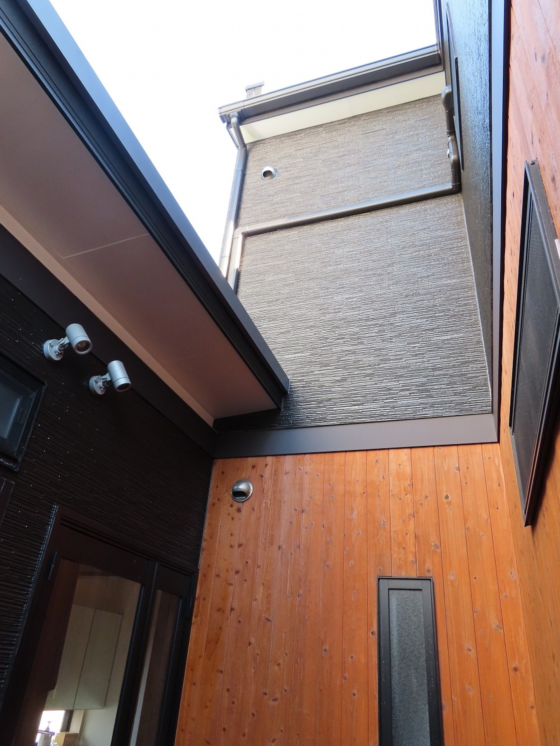 外壁部分は濃い目のブラウン一色でしあげるので、軒天は白色にしました。