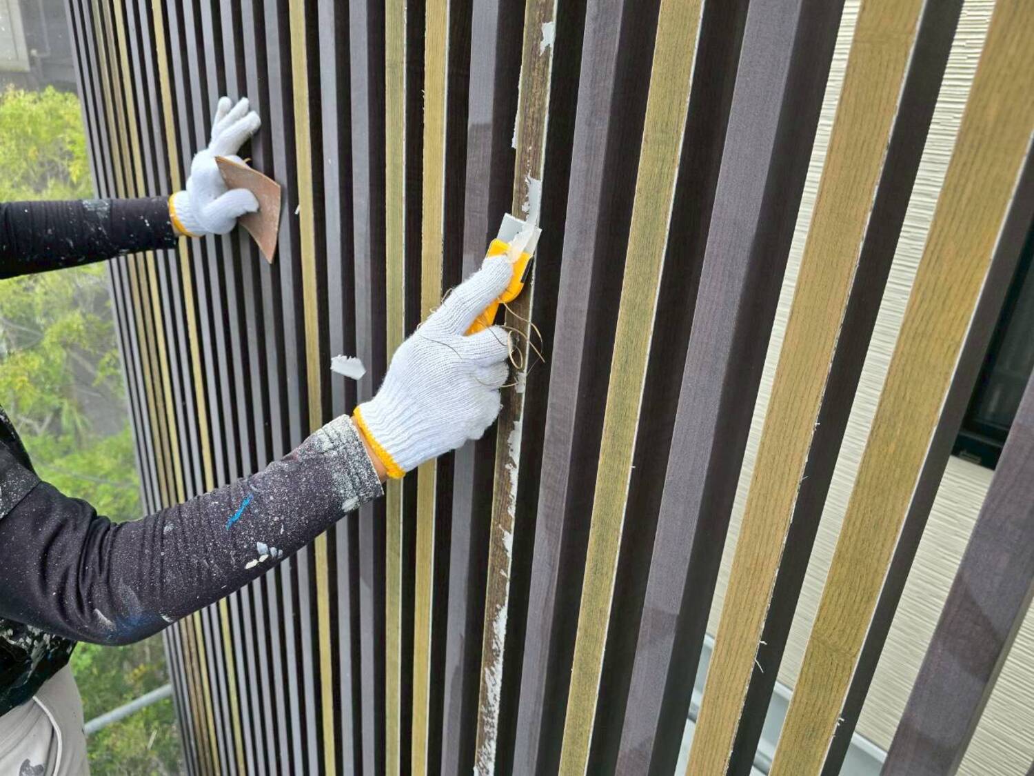 表だけでなく、裏も一本ずつシートを剥がしていきます。注意してみてみると、お家割のフェンスなどに、アルミフェンスの木目柄が結構あることに気が付きます。年数が経っているものは、今回の格子と同じようにピロピロしているものもしばしば…。錆びてしまう心配はありませんが、やはり耐用年数を超えた物はメンテナンスが必要なようです。