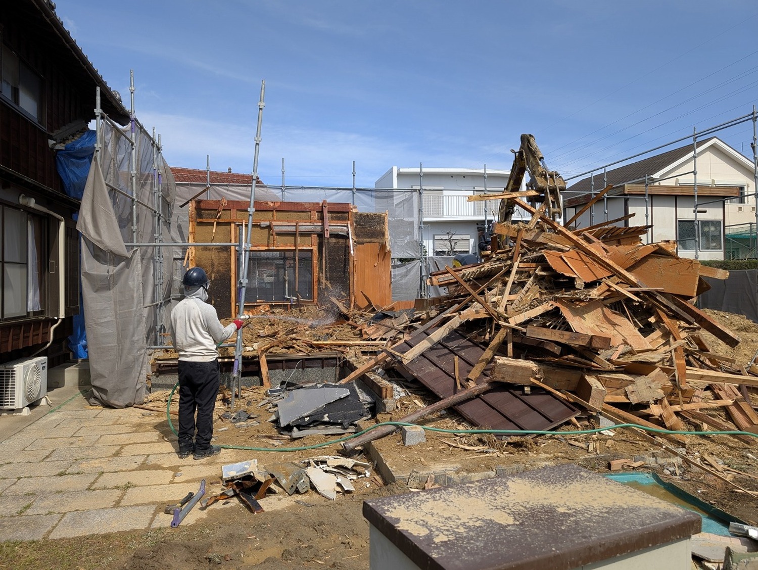 切り離し作業が終わったので、足場を立てて重機を使っての作業に入ります。ここまでくると、作業がグッと早く進みます。