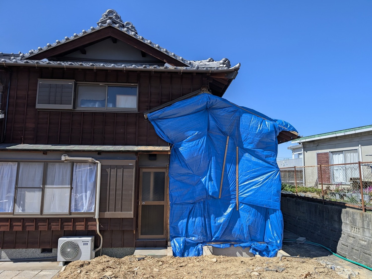 補修が終わるまでは、ブルーシートで養生をしておきます。