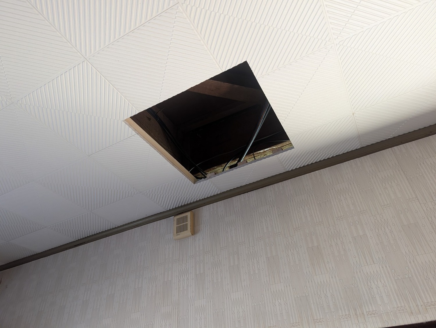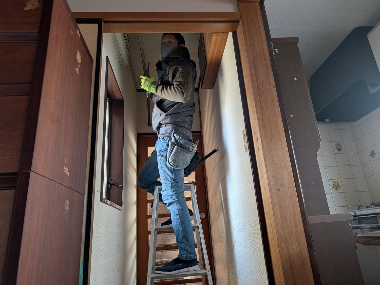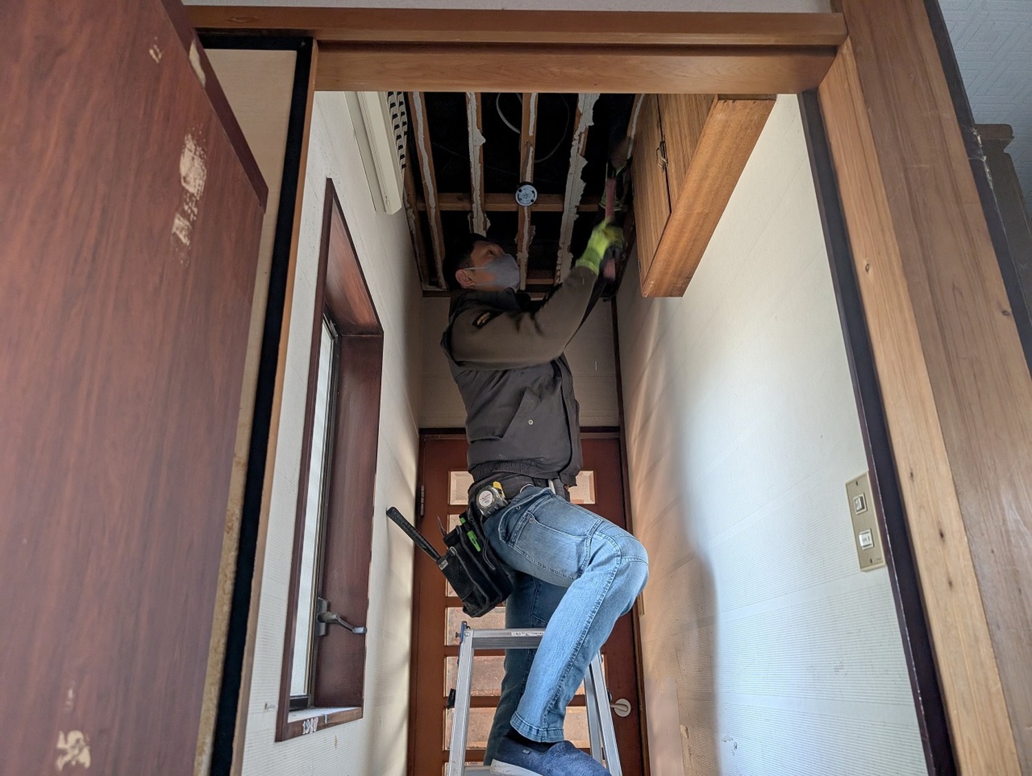 天井を外し、作業しやすいように天井下地まで取り除いていきます。
