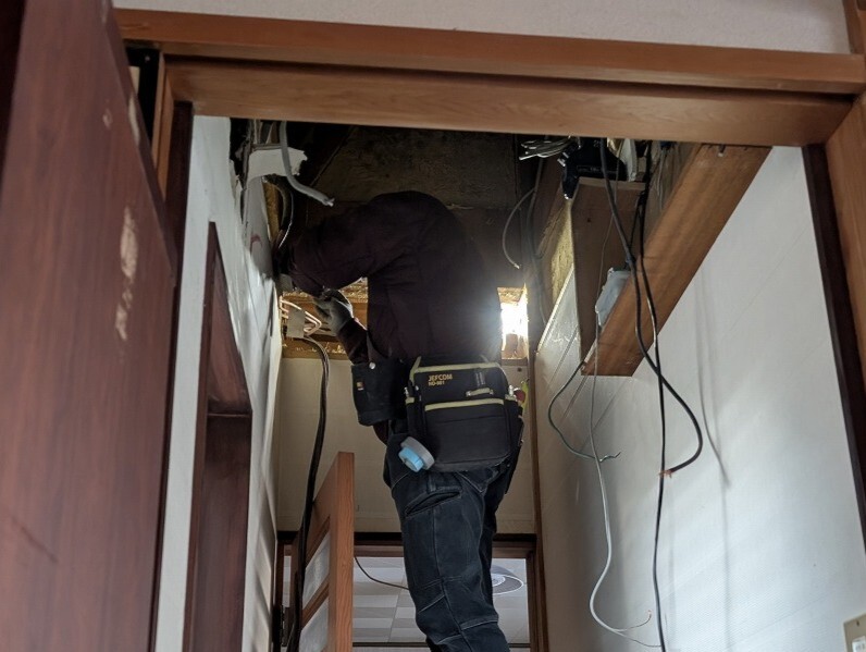 カッポリと穴の開いた天井に体を突っ込んで、電気屋さんが配線を行っています。