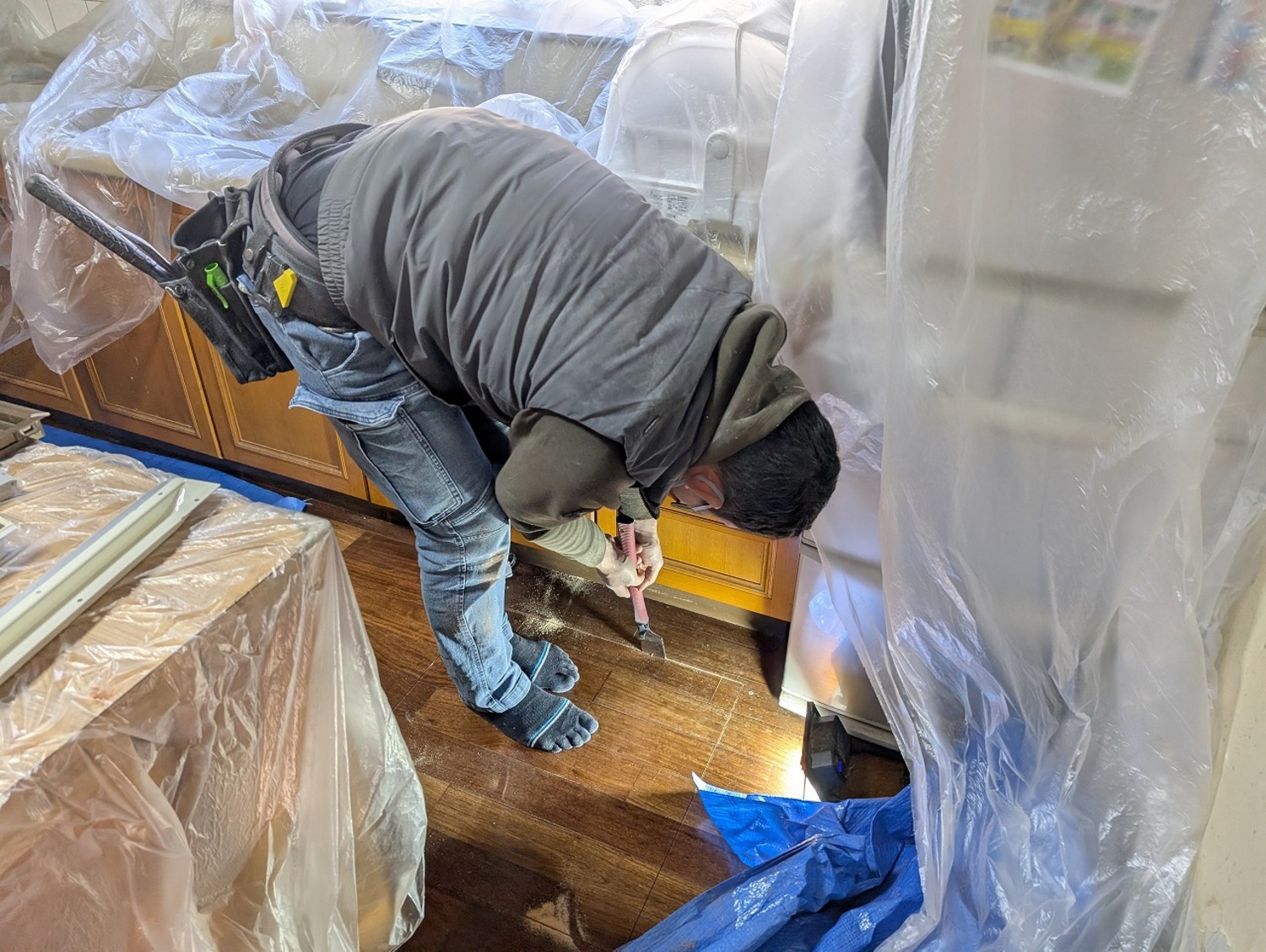 こちらのお家に点検口がなかったので、この機会に天井と床に点検口を設置します。天井の一部を点検口にするので、キチンは養生しました。