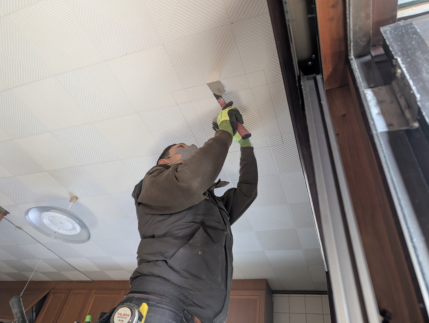 中では、ブレーカーの上の天井を大工さんがめくり始めました。