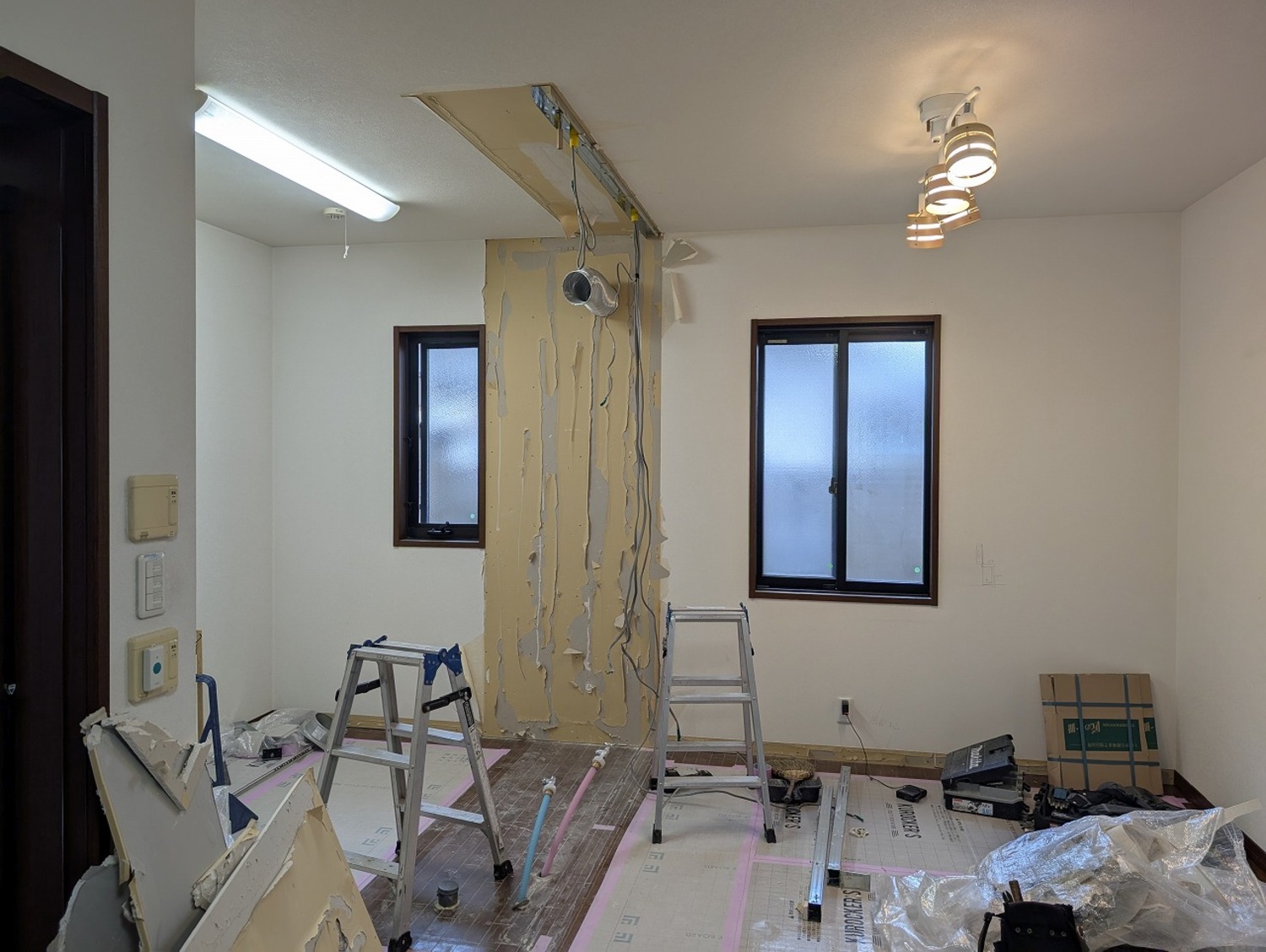 間仕切壁の撤去が無事に完了しました。換気扇のダクトなどは、既設の物を利用します。