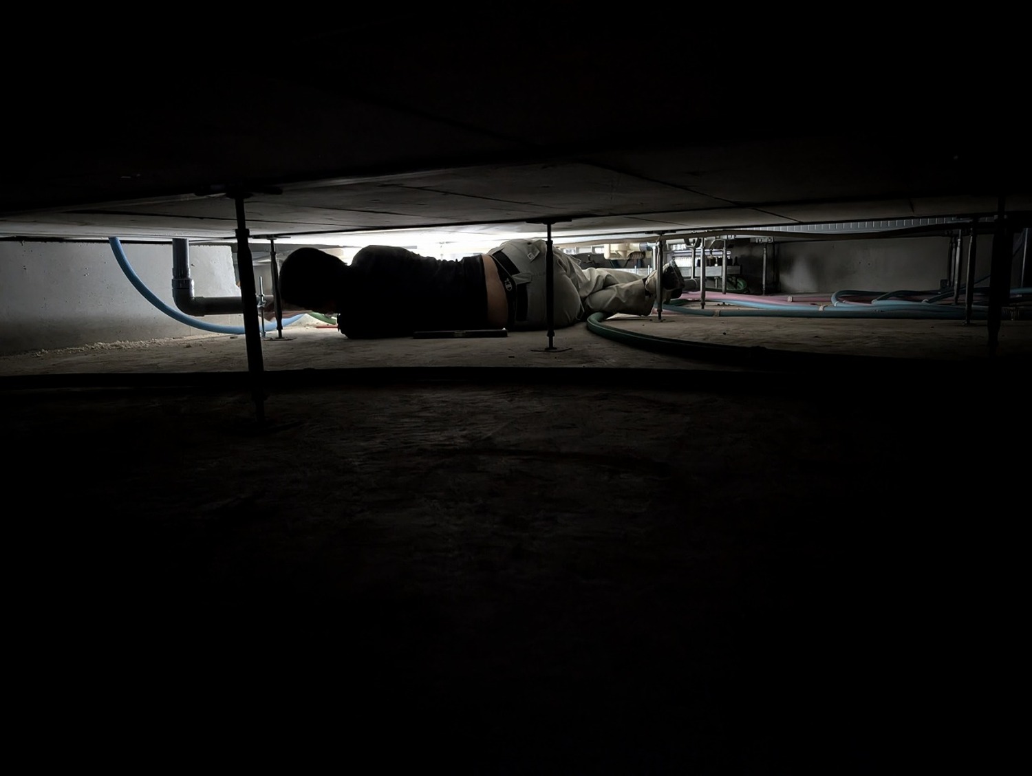 ガス屋さんと給湯屋さんが、新しく作った点検口を使って工事を行っています。