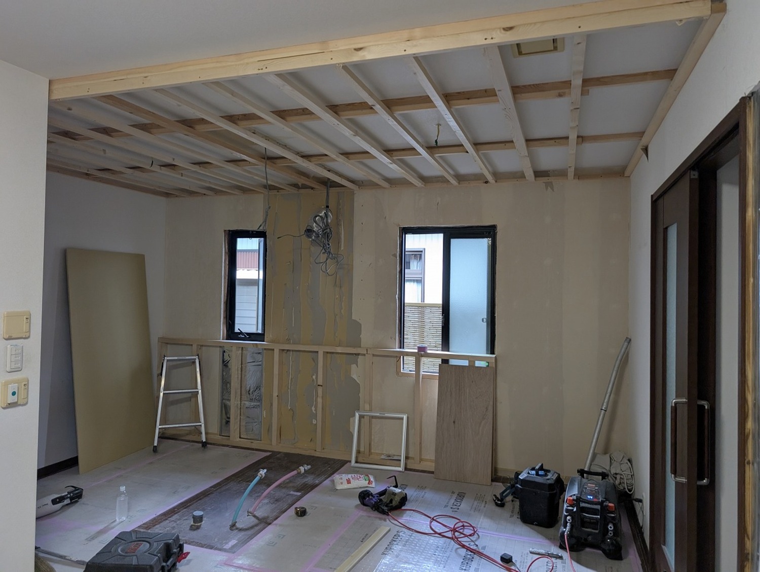 間仕切壁の撤去が無事に完了しました。換気扇のダクトなどは、既設の物を利用します。