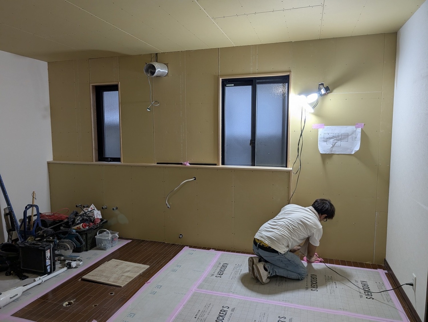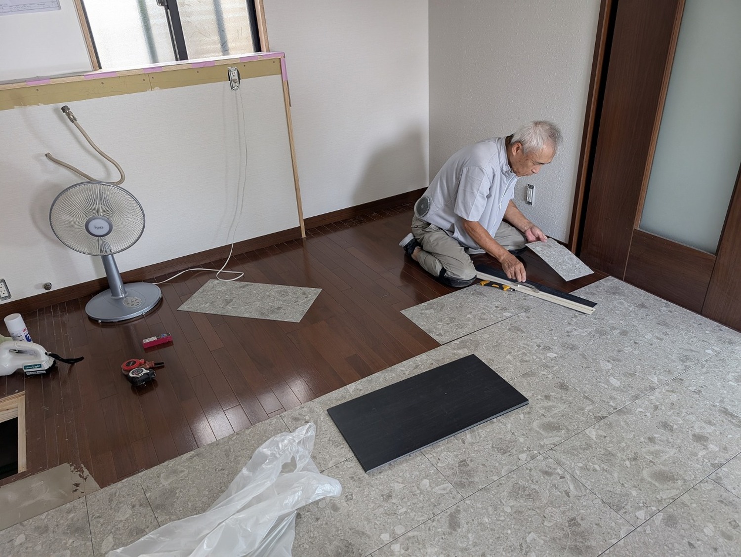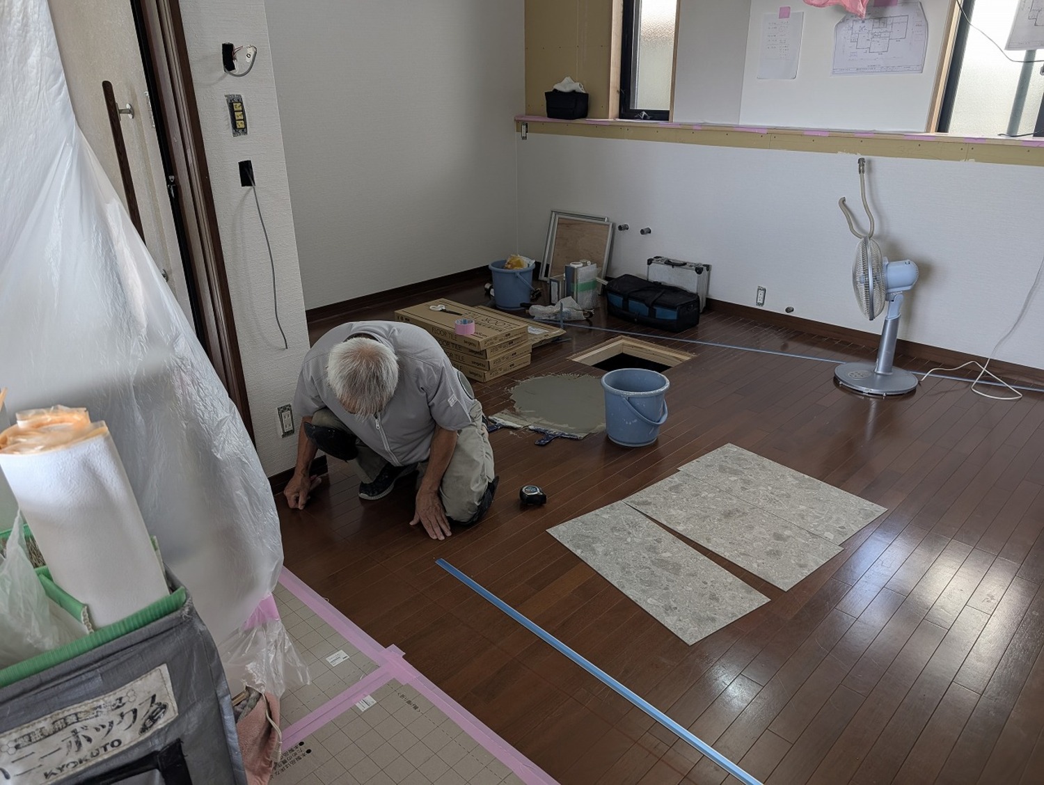 クロスが終われば、次はキッチン部分の床にタイルを貼っていきます。