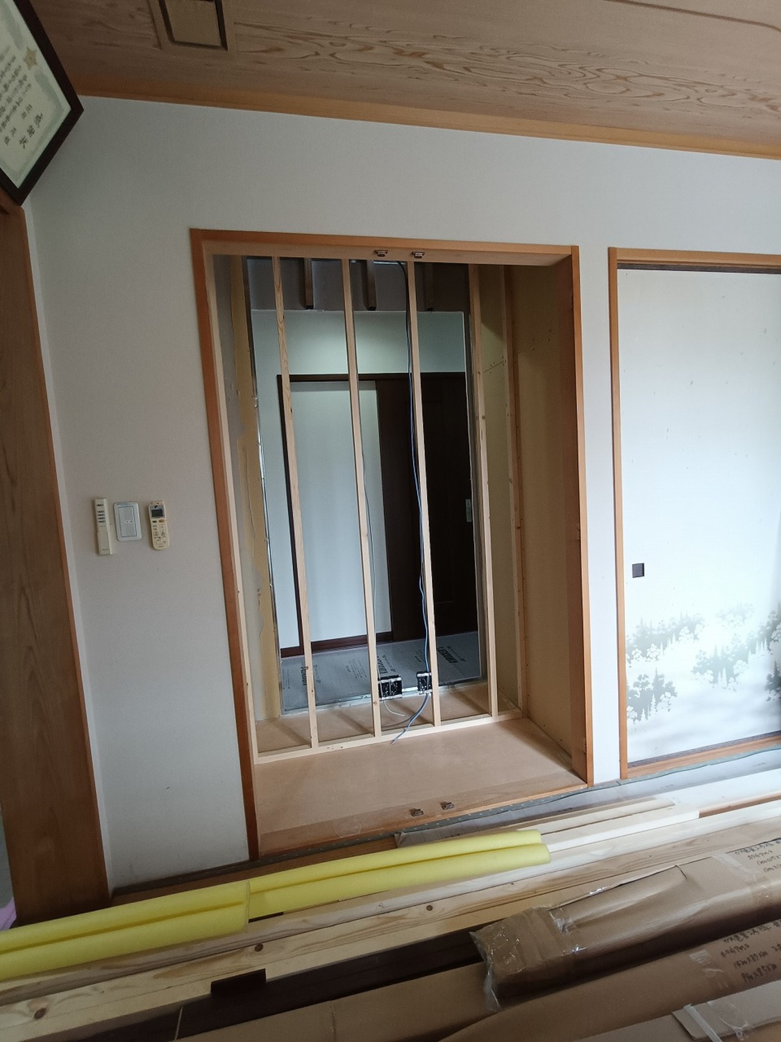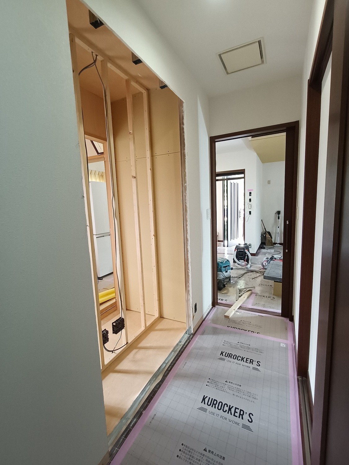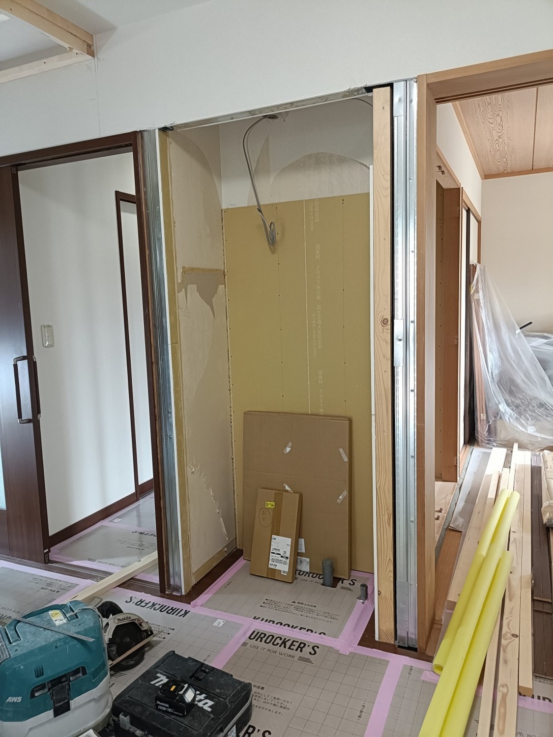 リビングについていた収納は手洗いコーナーになる予定です。扉などは撤去し新しく配管、配線を行い下地を張りました。