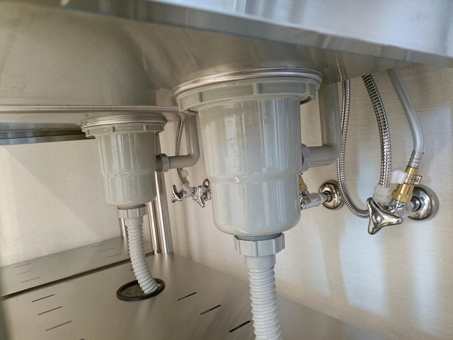 設備屋さんが頑張ってくれたおかげで、蛇腹部分がシンク下にキレイに収まりました。
