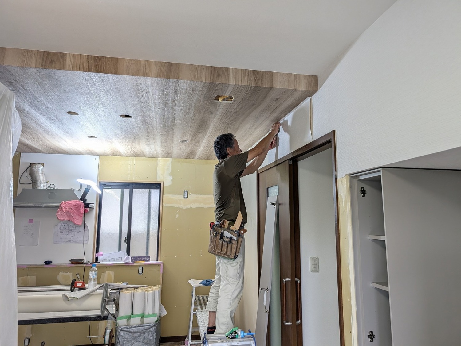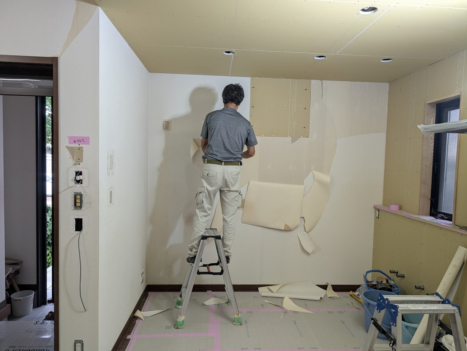クロス屋さんが、古いクロスを剥がしています。その後パテ処理等を行い新しくクロスを貼っていきます。