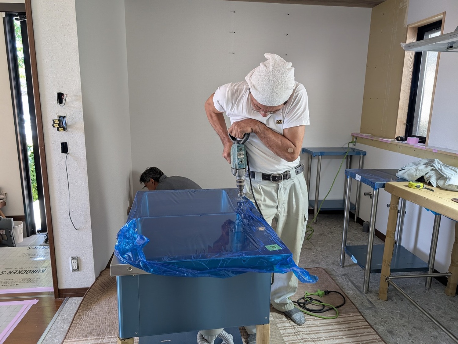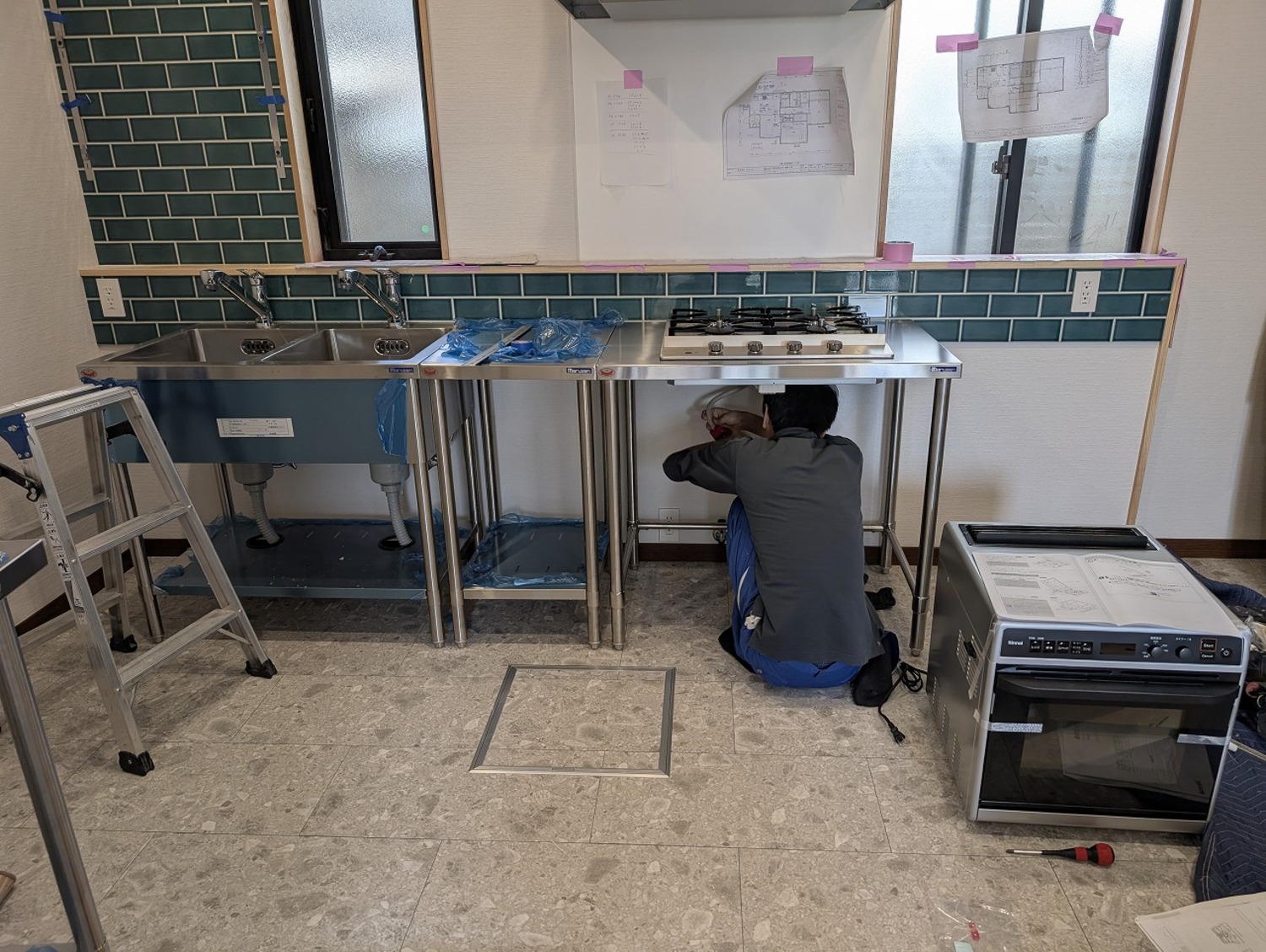 キッチン設備を設置していきます。設置したガラ配管や排水をつなげていきます。