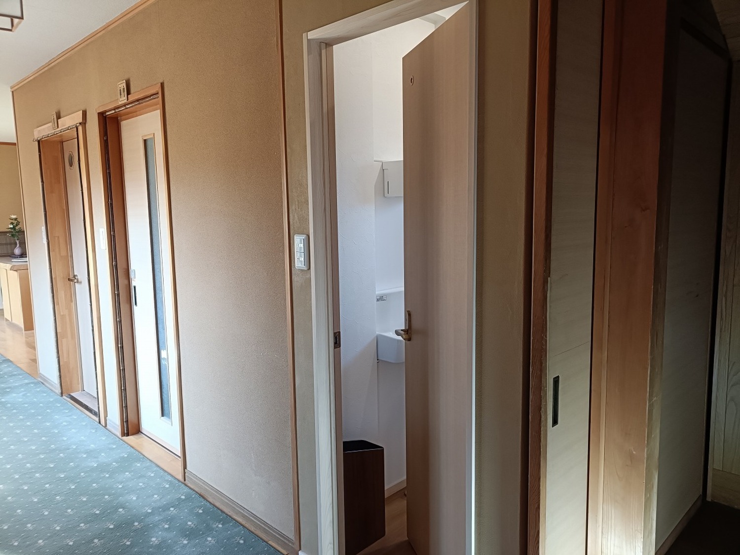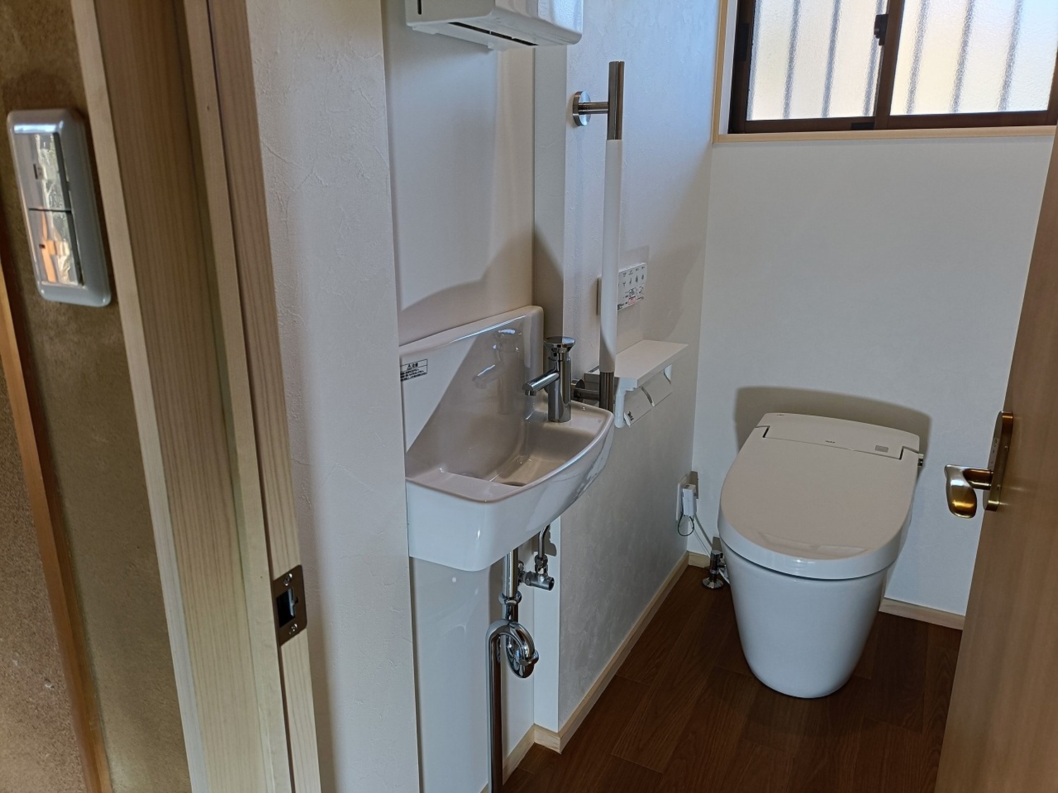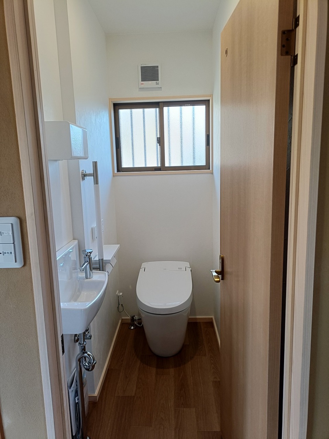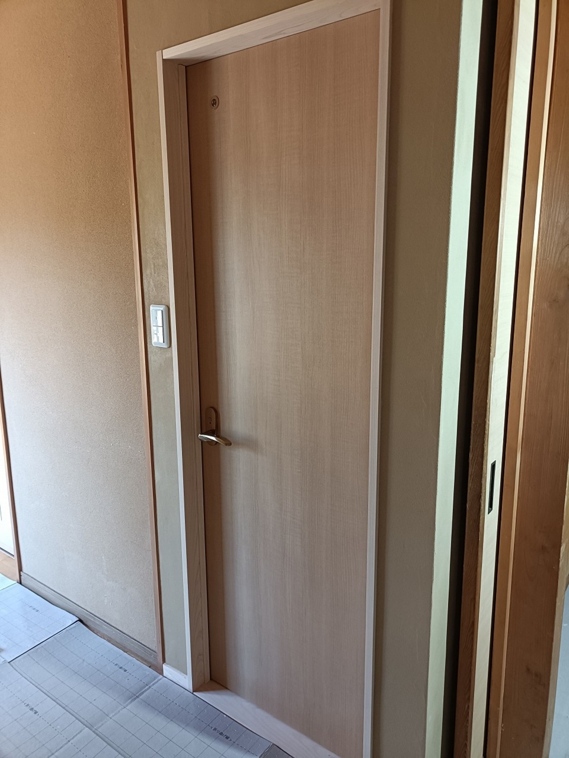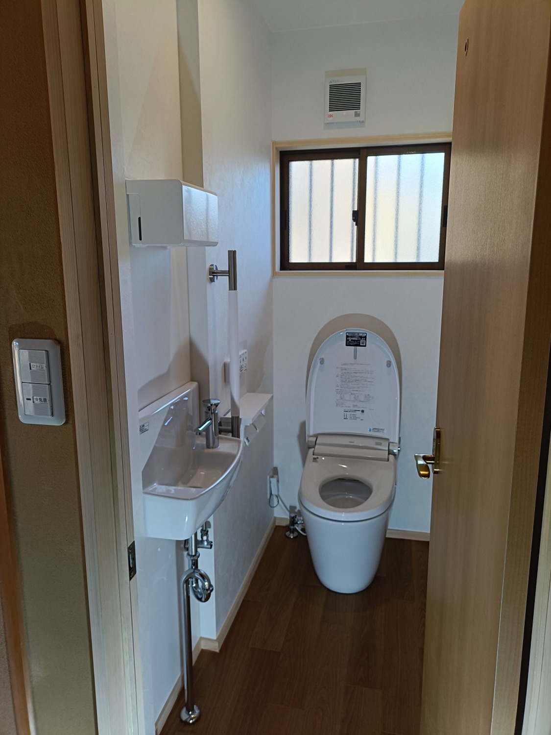 完成写真お寺さんの檀家さんたちが、集まりの時に使うトイレなので、廊下で扉が人とぶつからないように、内開きにドアにしました。住宅用のトイレでは扉は外開きに付けますが、今回は特殊な事情なので内開きで付けました。