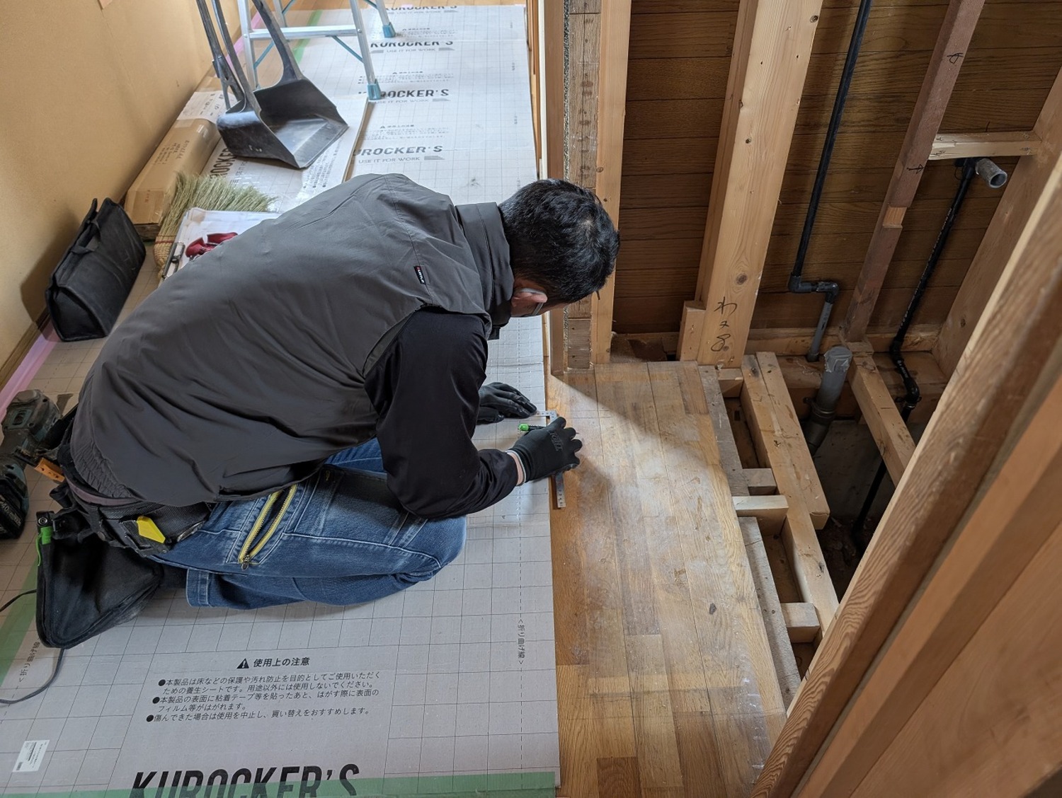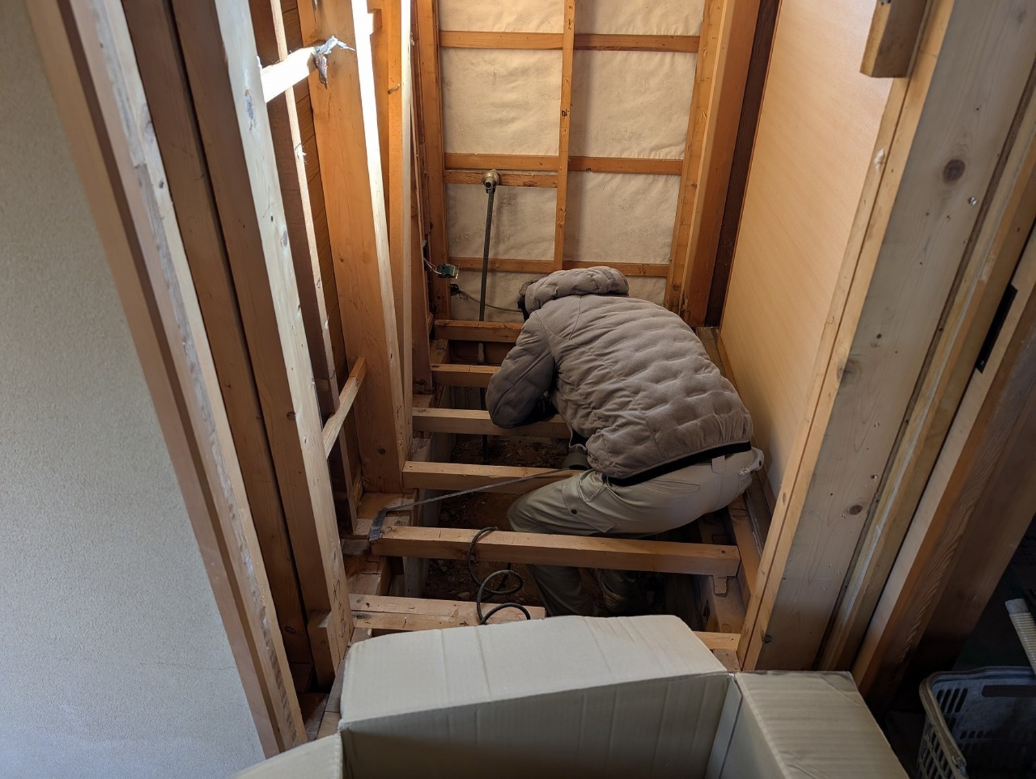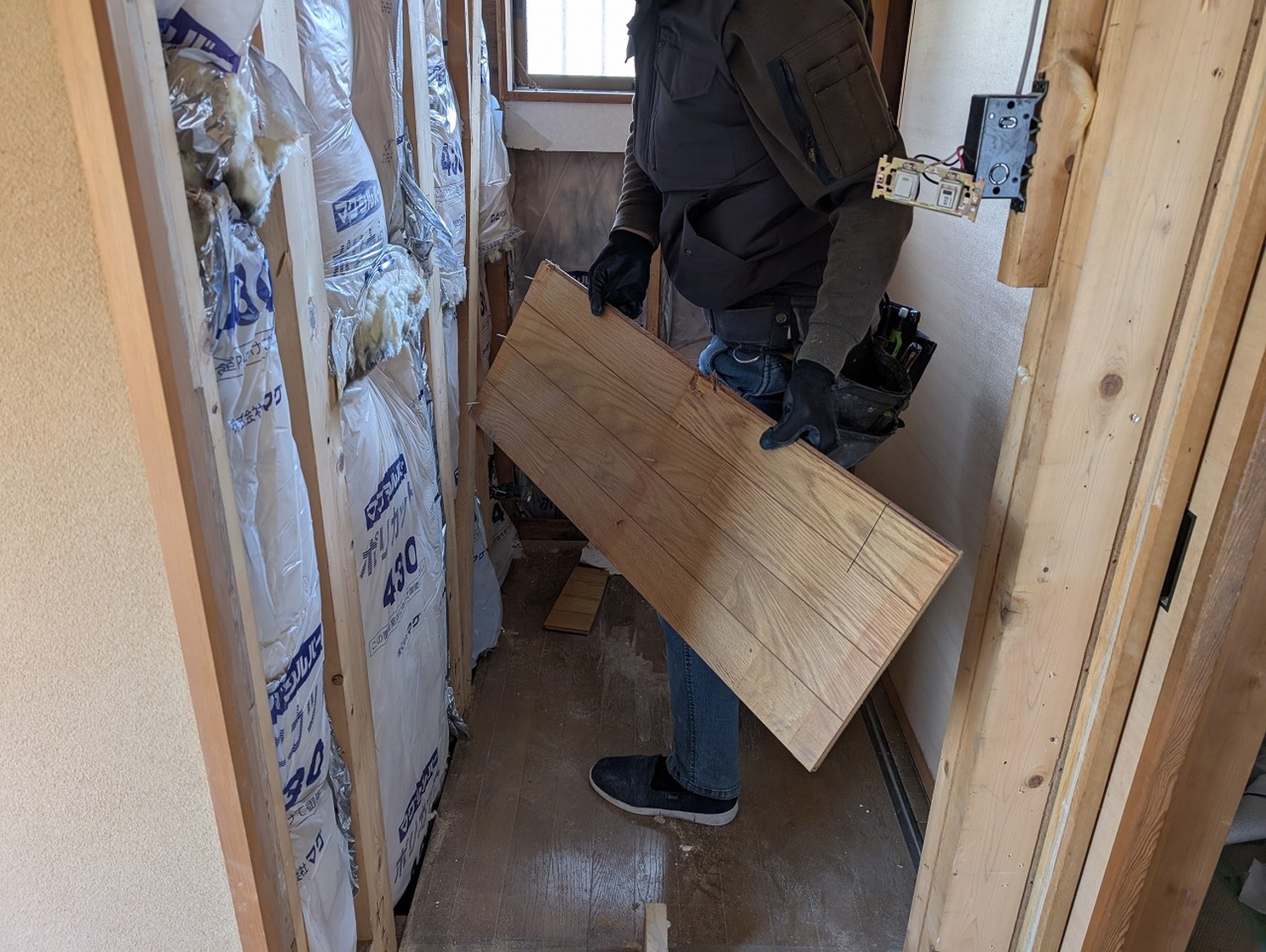 壁の下地には使い廻しの合板フローリングだったのに、床の根太には、通常より太く丈夫で今じゃとても使うことができないヒバが使われていました。前回、ここを工事した会社さんのやってあることの温度差が激しくて困惑しました。