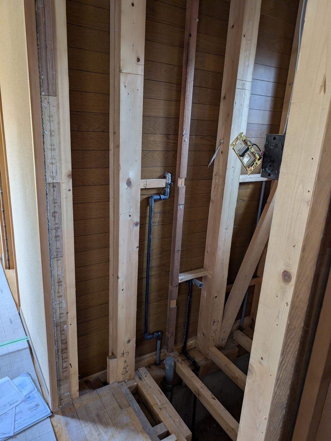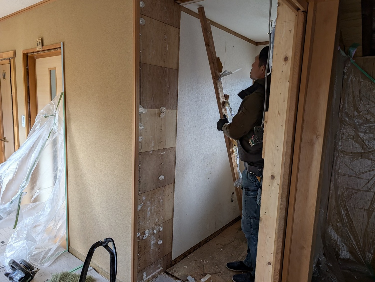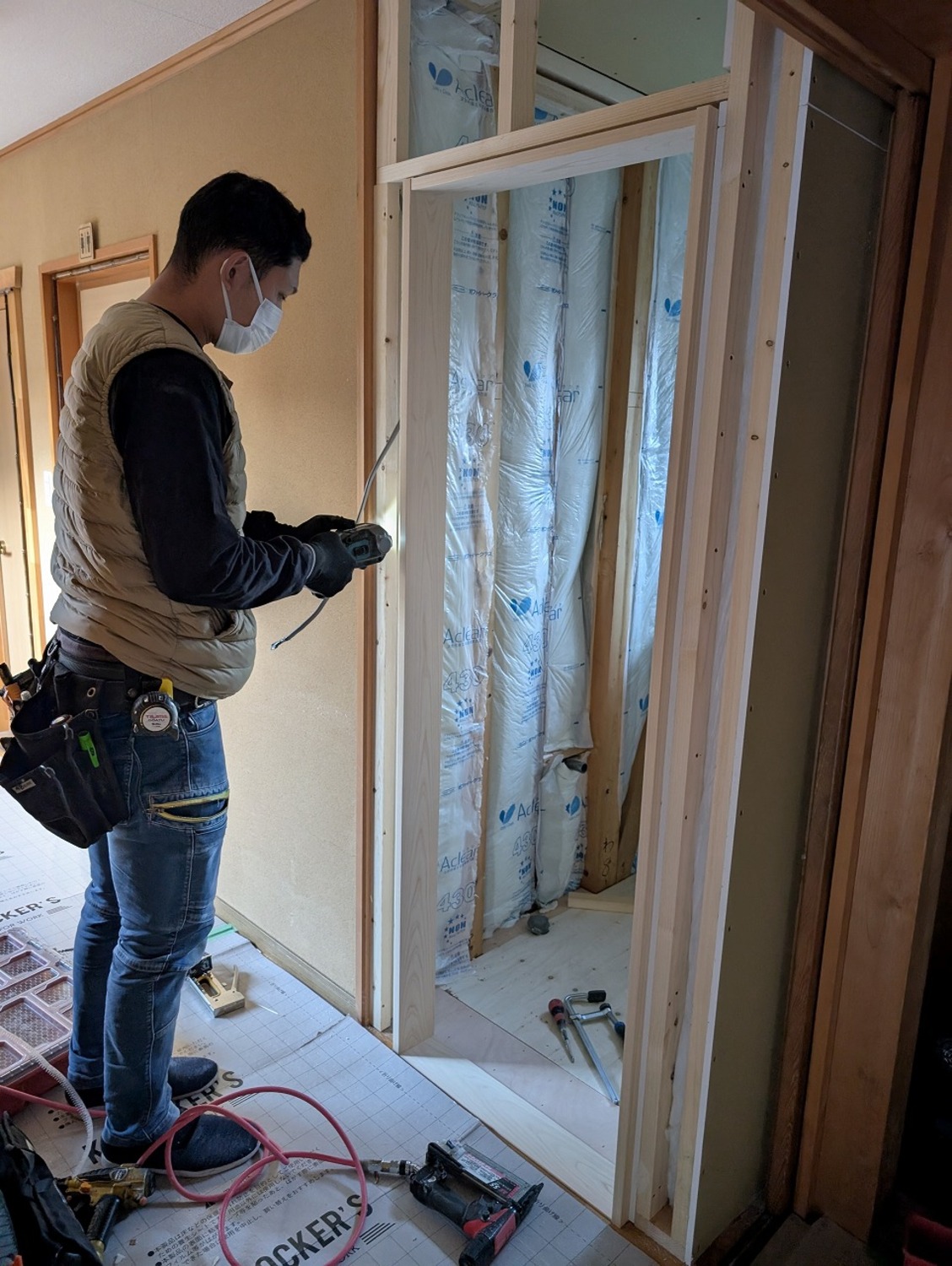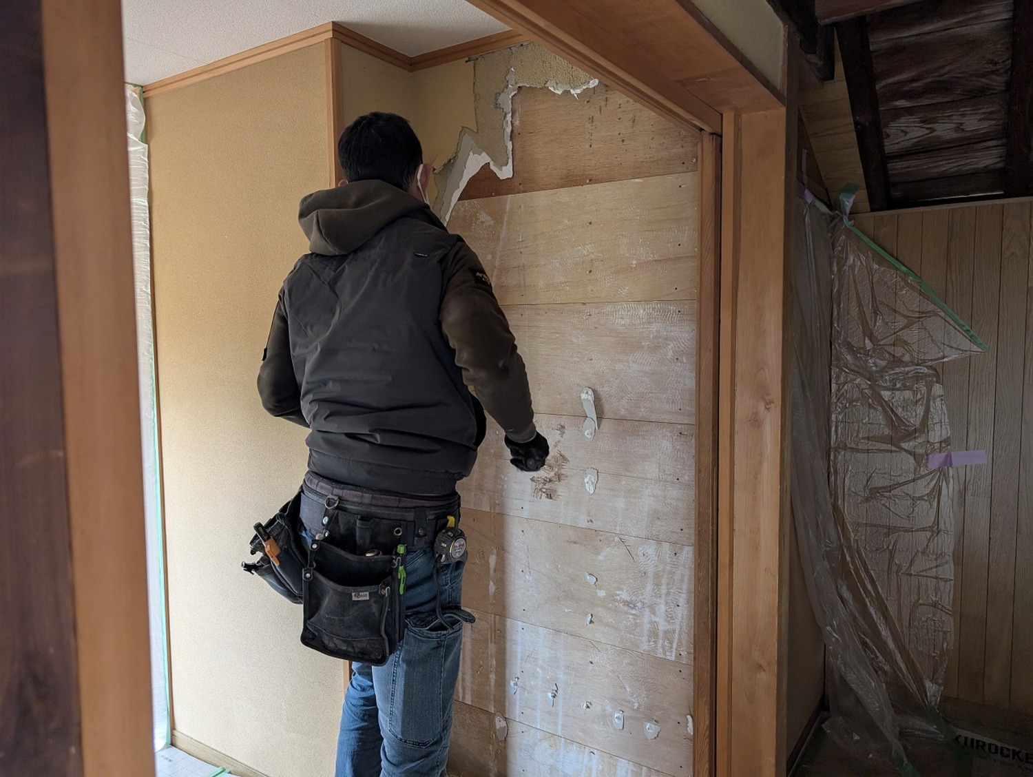 壁の下地には使い廻しの合板フローリングだったのに、床の根太には、通常より太く丈夫で今じゃとても使うことができないヒバが使われていました。前回、ここを工事した会社さんのやってあることの温度差が激しくて困惑しました。
