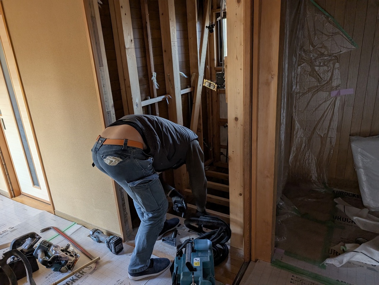 まずはトイレを撤去します。配管などに蓋をしておきます。