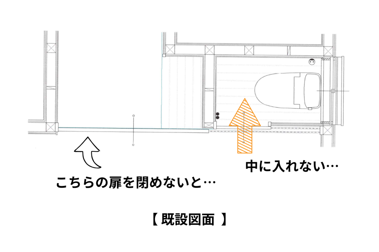 廊下にある扉を閉めないと、トイレに入れない。逆に、トイレに入ってる時に廊下の扉を開けられたら出られない…そんな間取りになっていました。