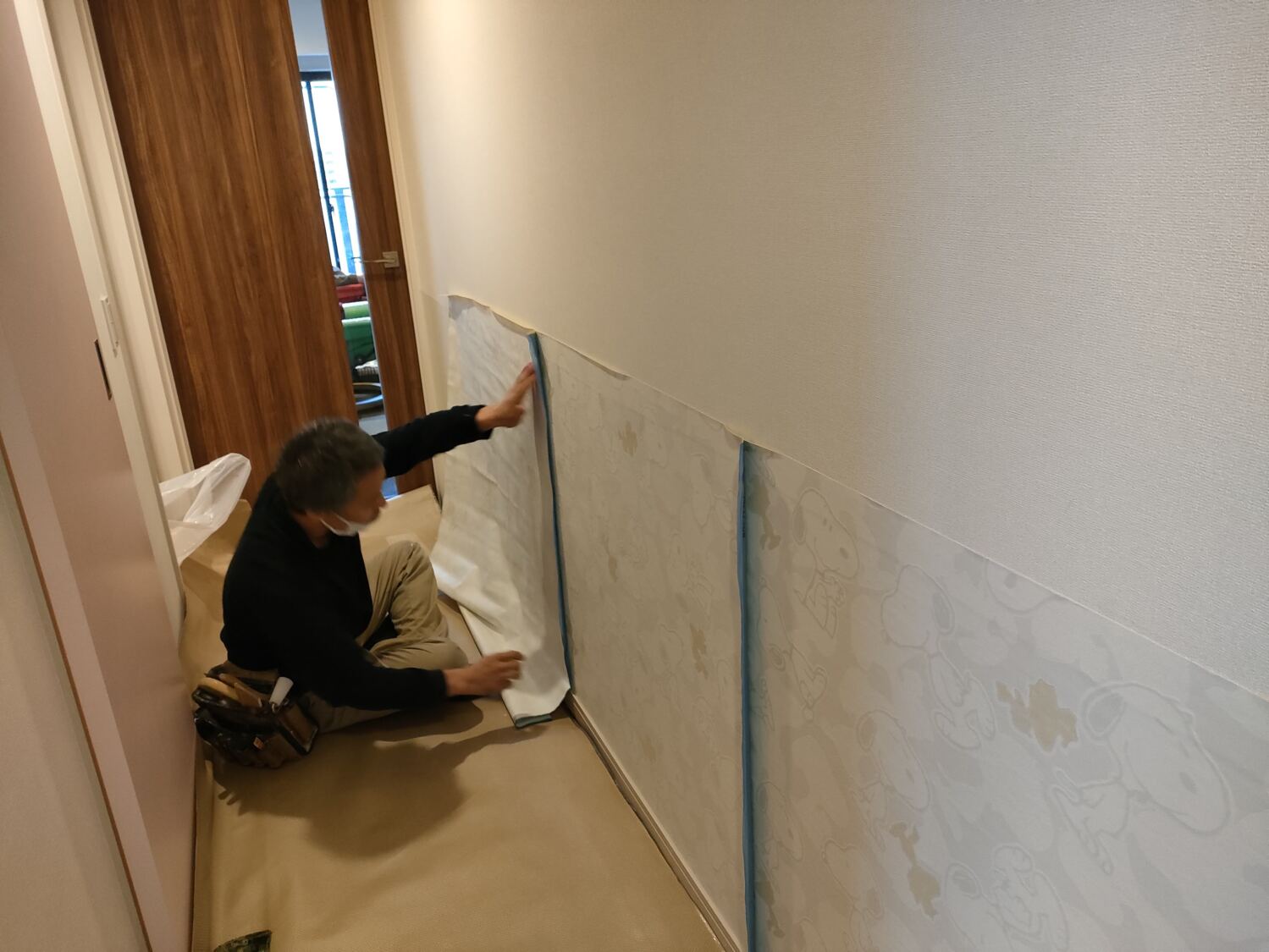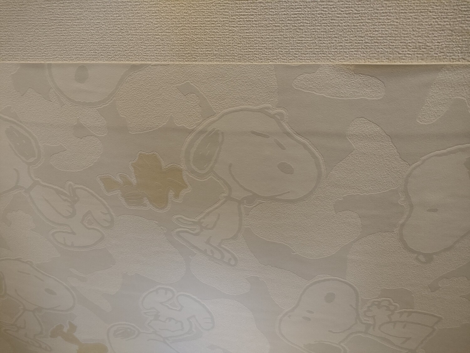 施工中大きなスヌーピー柄のクロスです。派手な感じではないですが、スヌーピーが印象的です。