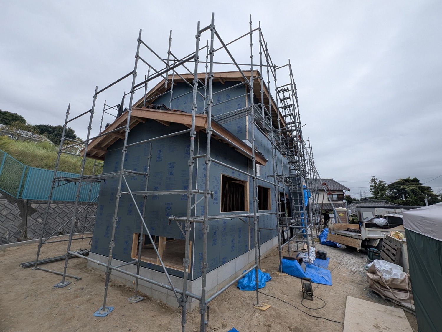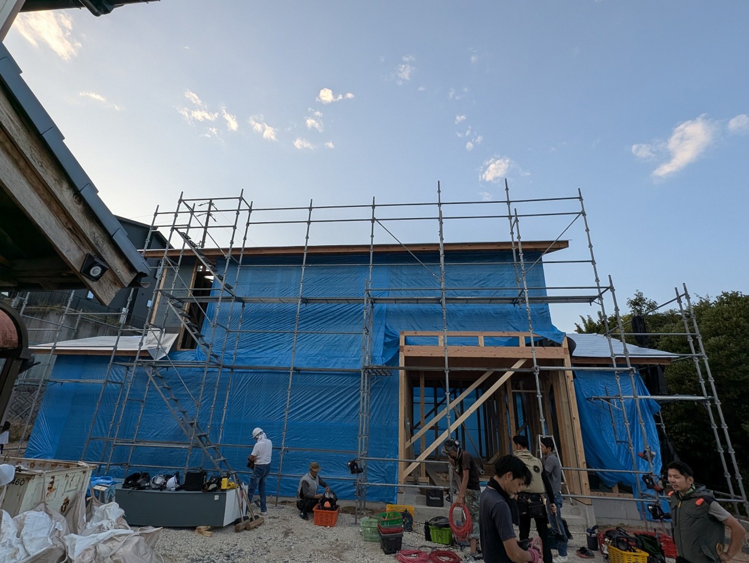 夕方には養生も終えて、無事に建前を終えることができました!棟梁さん、応援の大工さん。ありがとうございました。