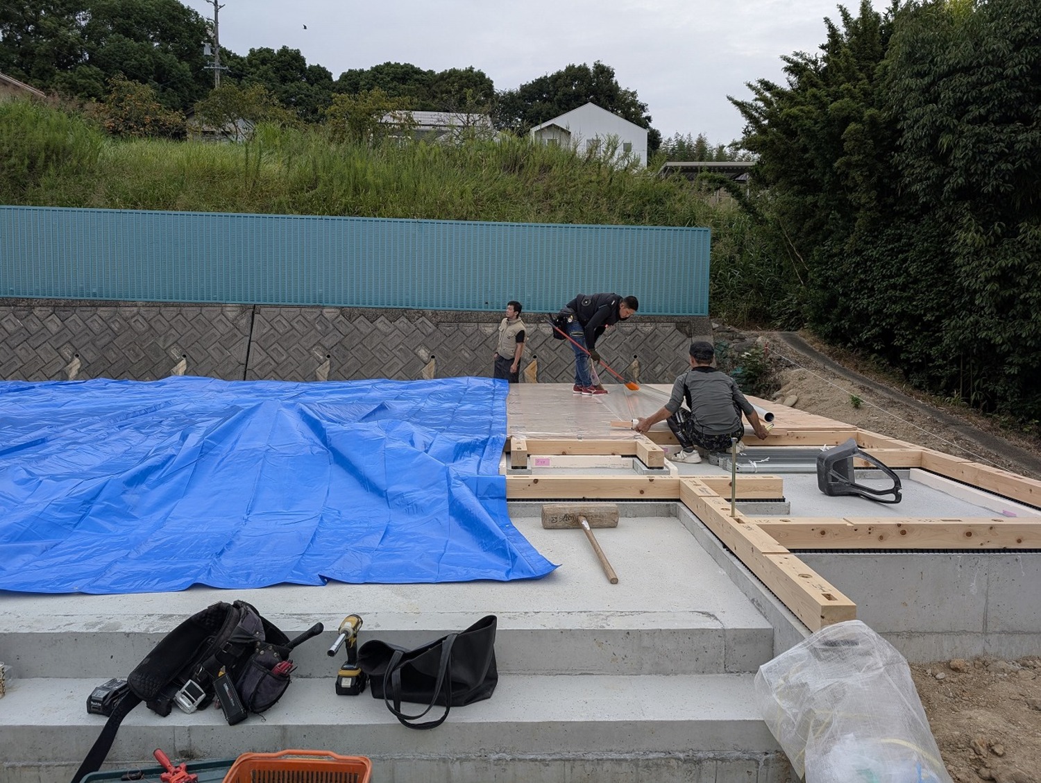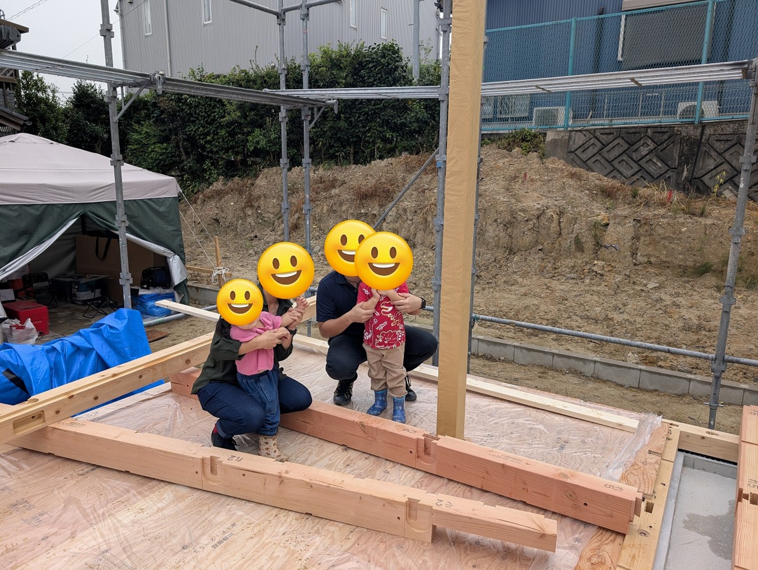これから、日陰のないなか基礎工事が始まるので休憩スポットと作りました。ここ最近の夏の暑さは職人さんを苦しめる一つの要因なので、スポットクーラーやドリンクなど、やれるだけのことはやってみました。