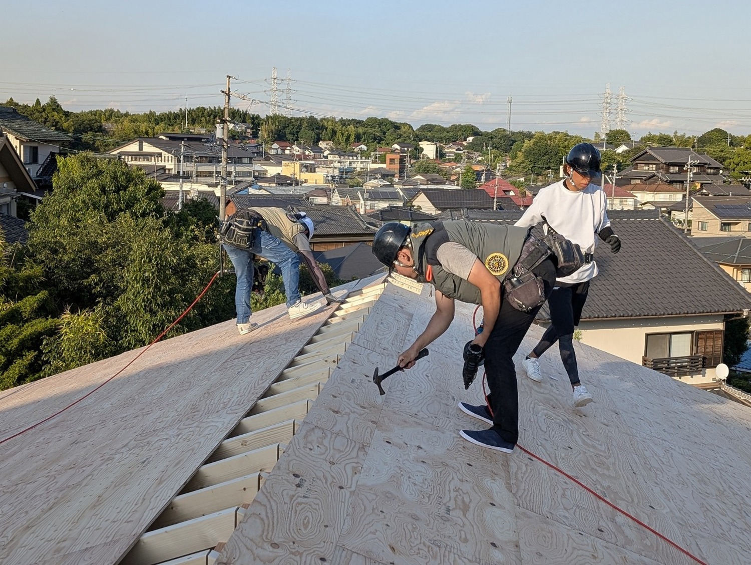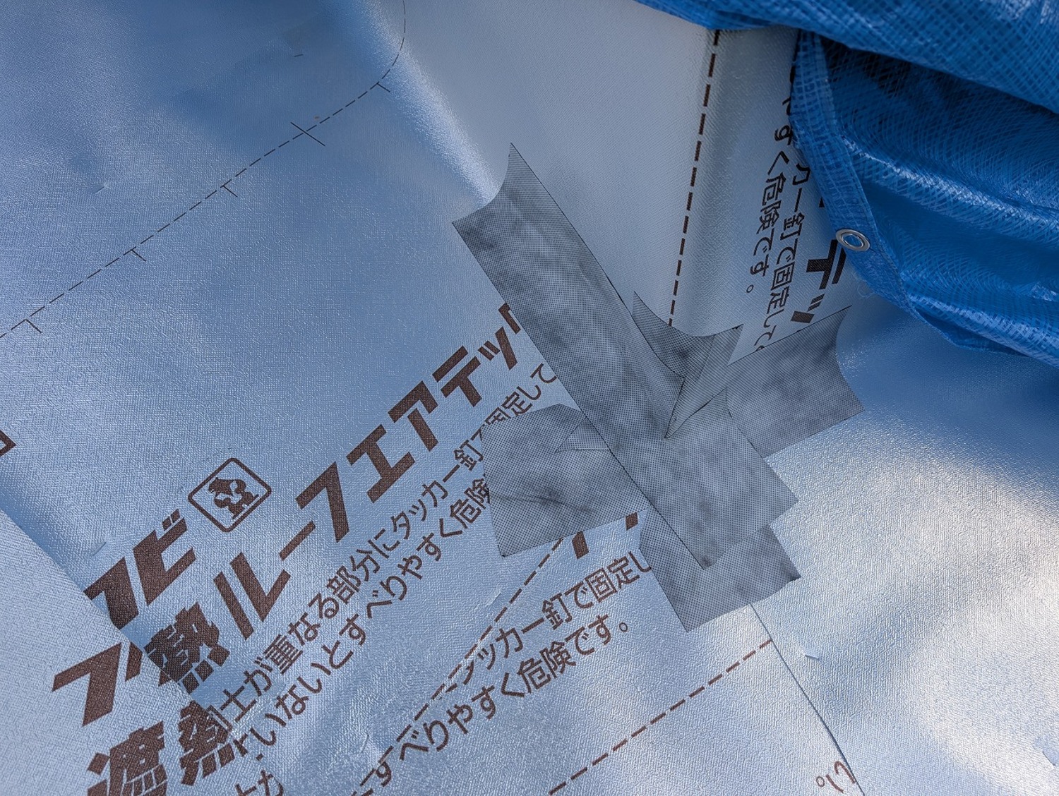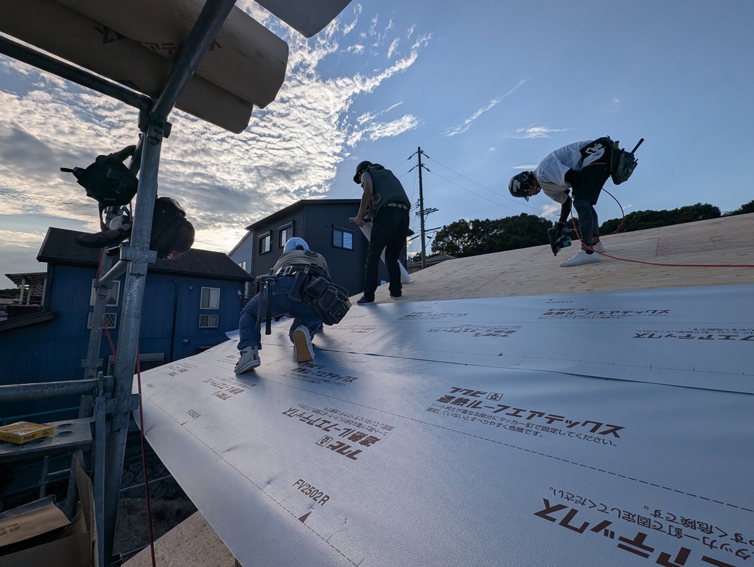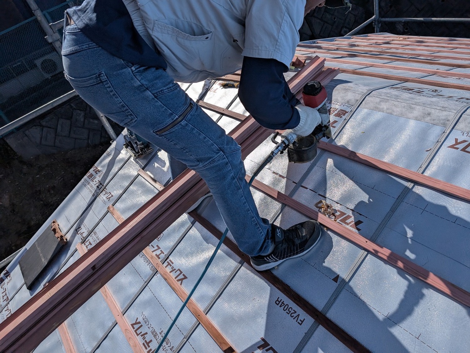 日差と熱を、しっかり反射してくれる遮熱ルーフィング。お家にとってはいい素材ですが、瓦屋さんはその反射を全身に受けながら作業をしてくれました。