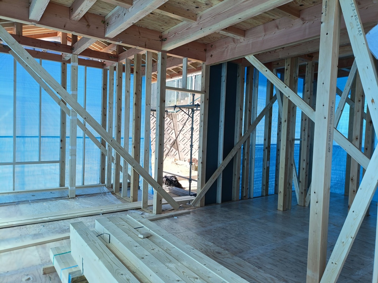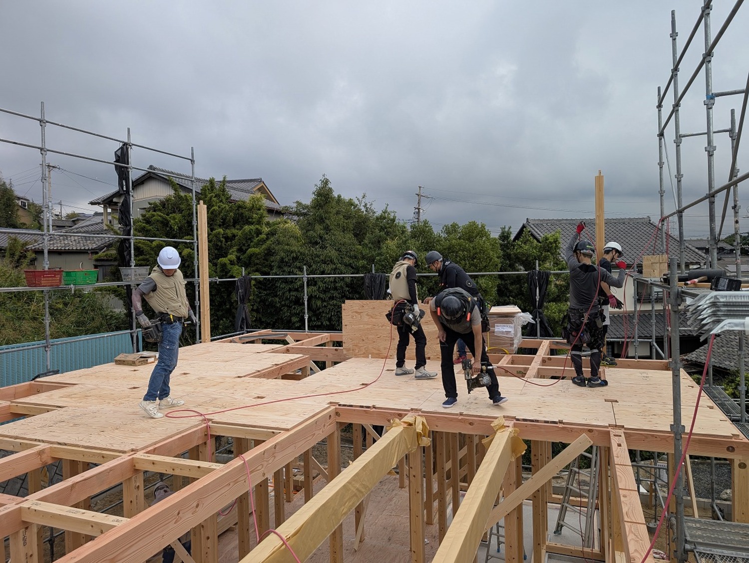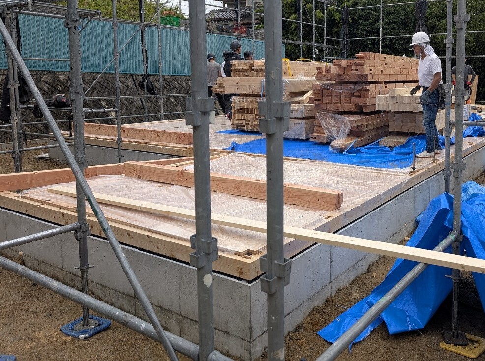 暑さはあるものの、曇ったり晴れたりのお天気で、真夏と比べると過ごしやすい気候。ズンズン作業が進み、あっという間に2階床の合板を張る作業に入りました。