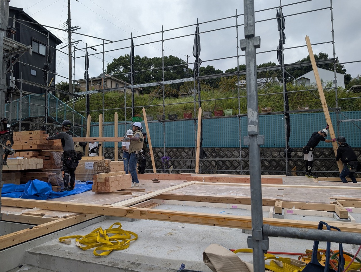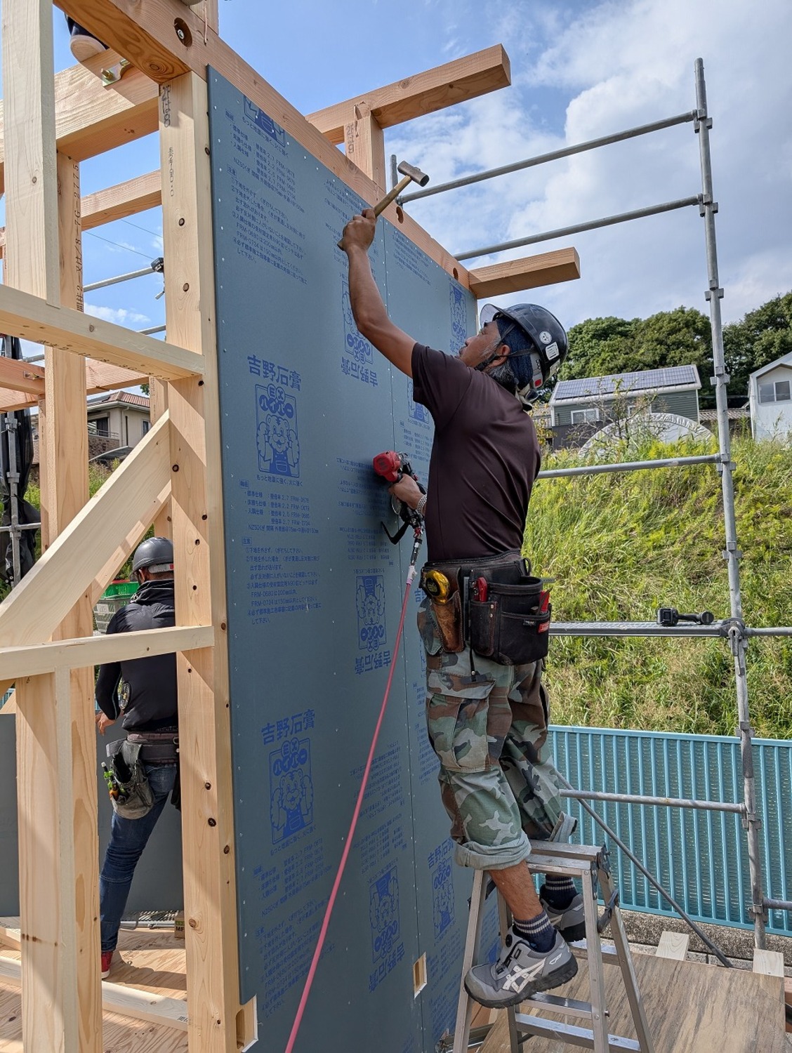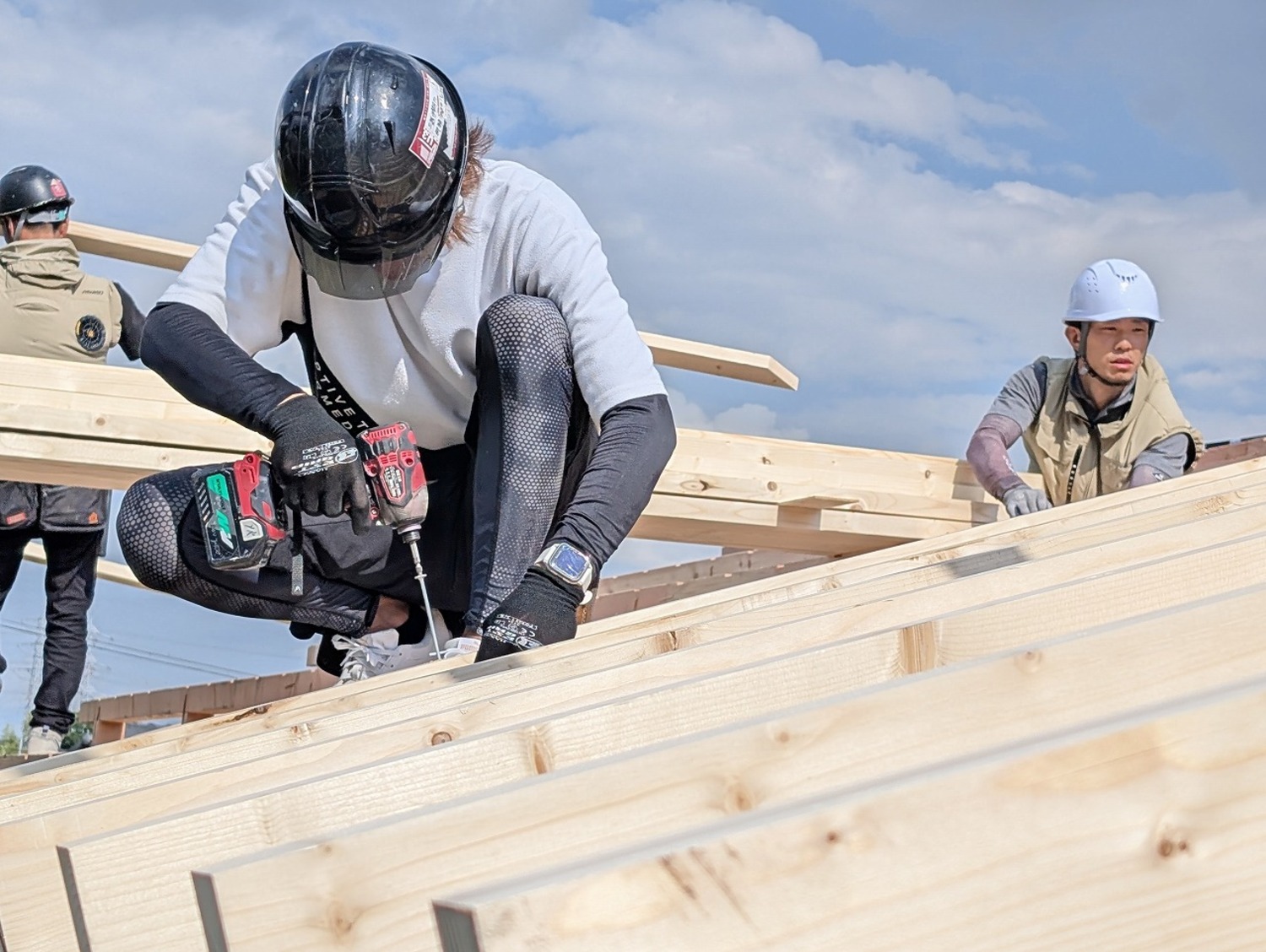 暑さはあるものの、曇ったり晴れたりのお天気で、真夏と比べると過ごしやすい気候。ズンズン作業が進み、あっという間に2階床の合板を張る作業に入りました。