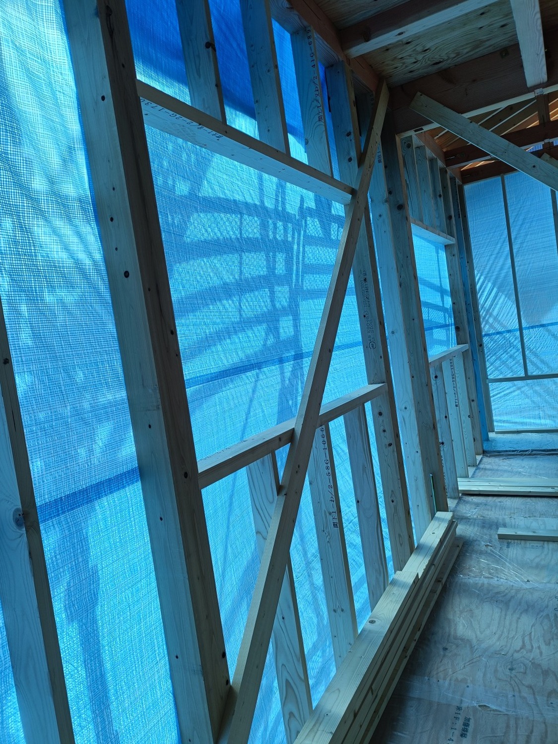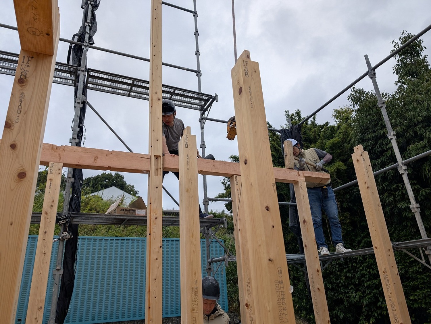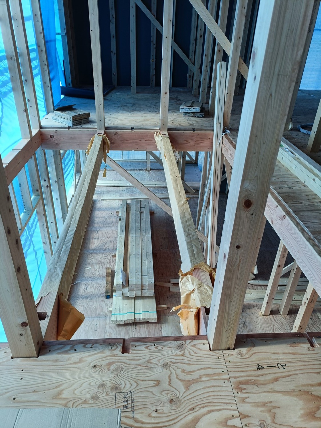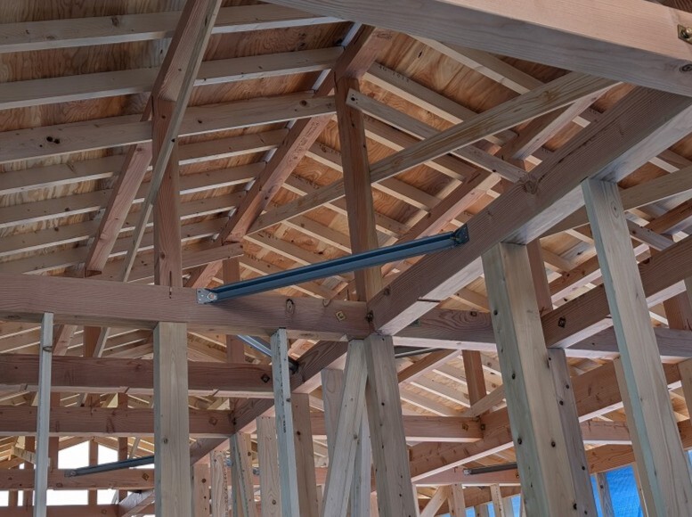 中では金物を取付中。鋼製火打ちなどを取り付けていきます。