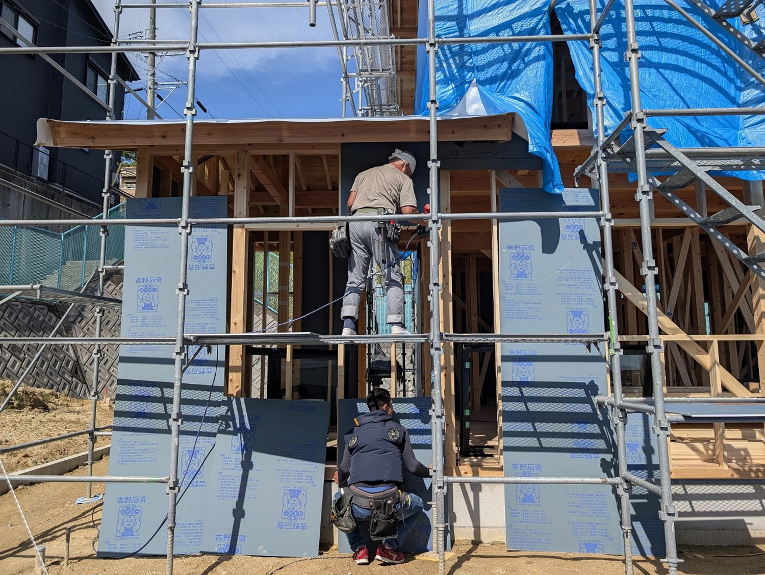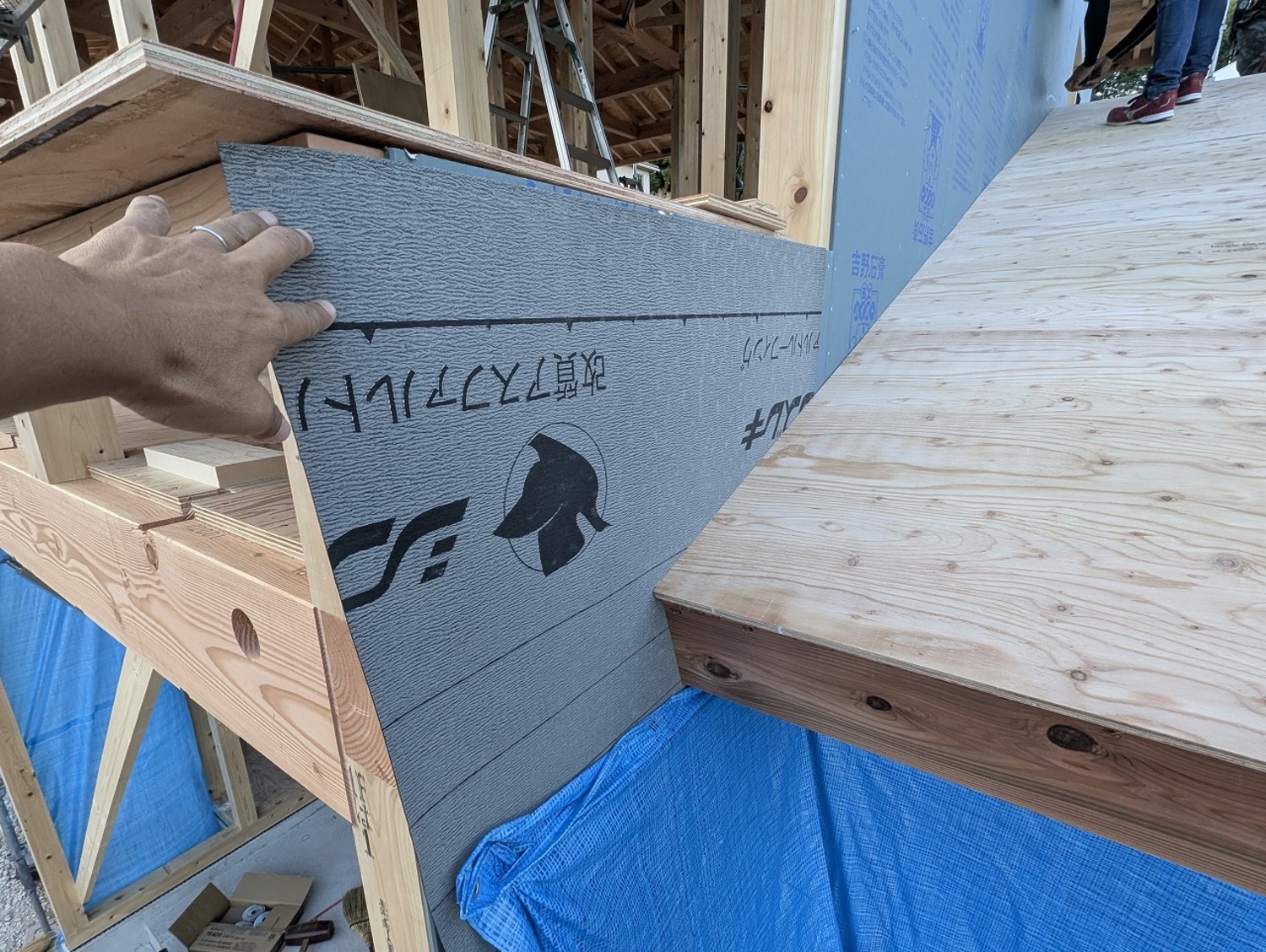 下屋の部分は、先行してパネルとシートを貼りました。雨漏れの対策は抜かりなく、丁寧に段取り良く進めていきます。