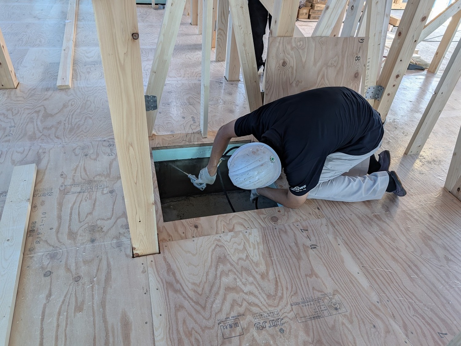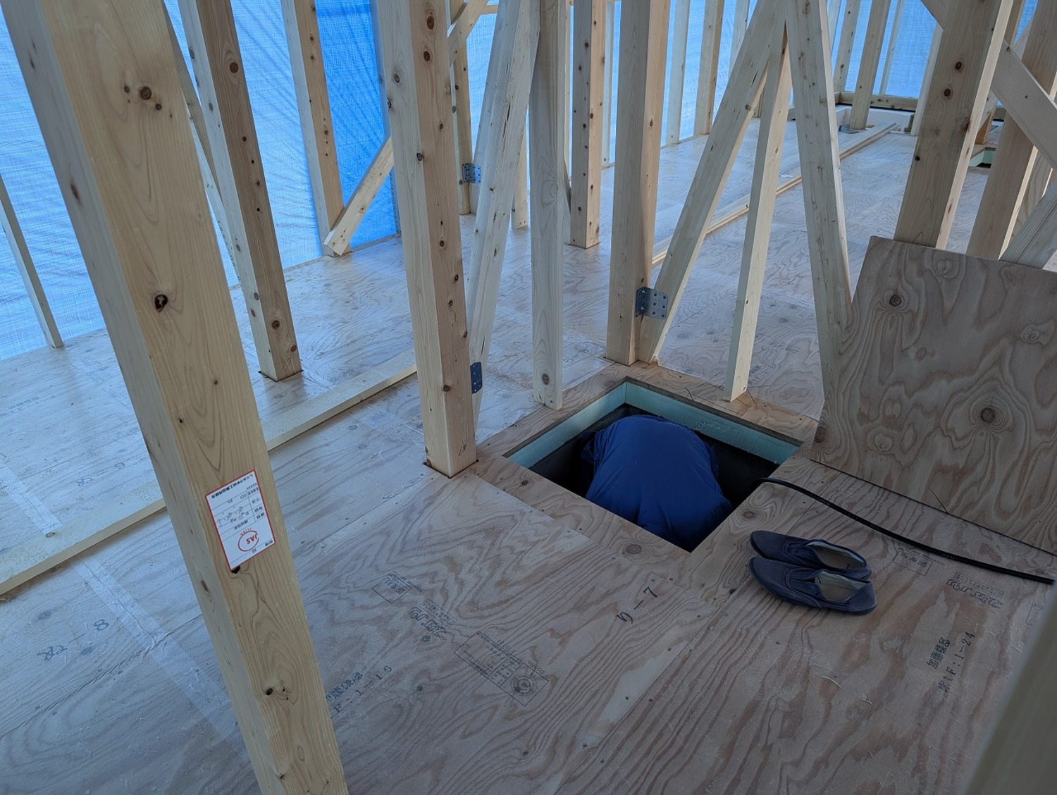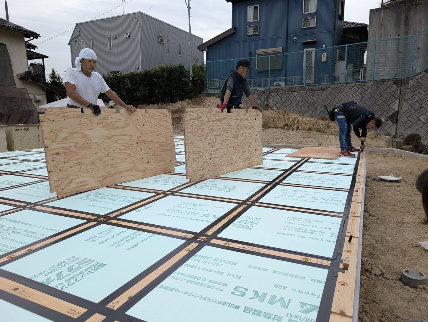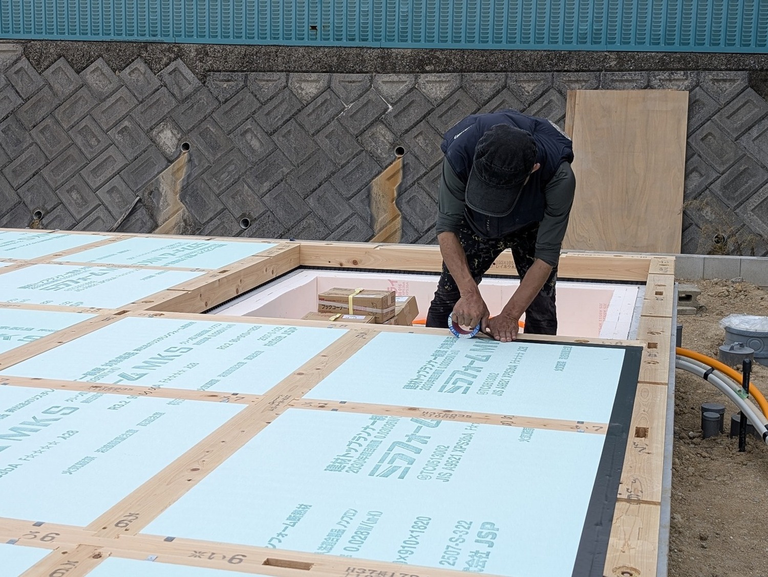気密テープを十字に貼り終え、床の合板を張っていきます。