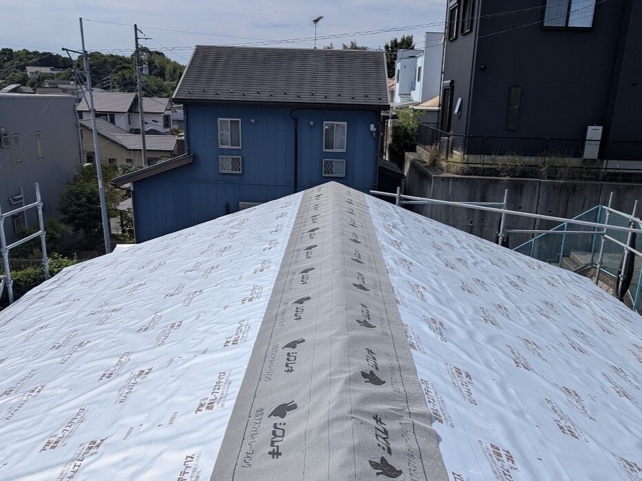 お屋根の棟の部分には、雨に強い改質アスファルトルーフィングをかぶせました。